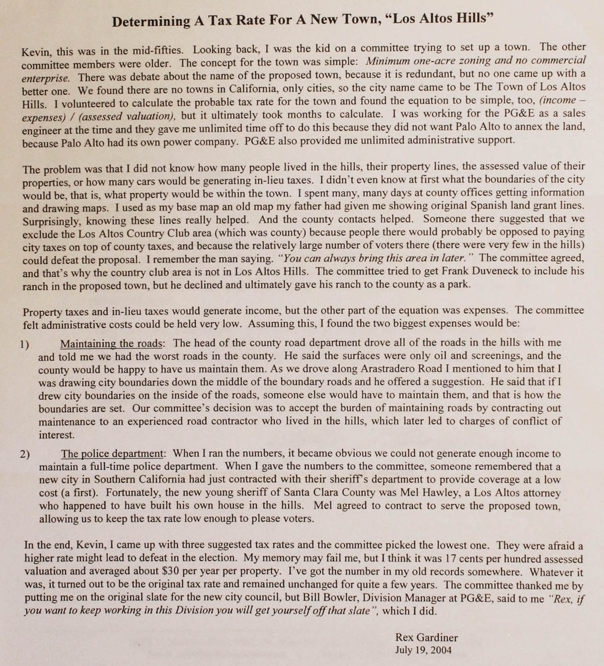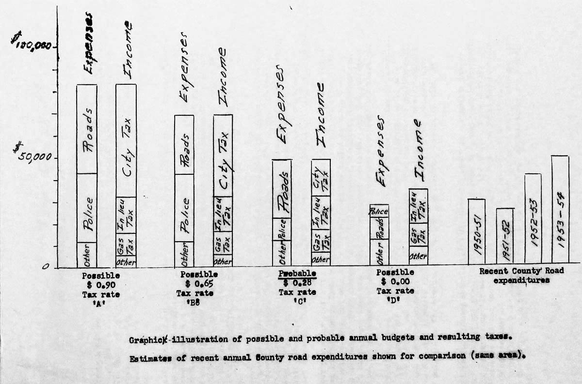 Following is a note written by Rex Gardiner (The volunteer assigned to do all the leg work and preparation of documents leading up to the vote for incorporation). It was written nearly 50 years after the event. In it he explains the situation he found himself in, and the background to the document he created at that time showing four possible "Balance Sheets" for the operation of the proposed town - each necessitating an associated tax rate.to garner enough revenue to cover the anticipated expenses. As he explains in this letter, the Incorporation Committee chose the one with the lowest tax rate (and thus the smallest budget) as they were afraid that a higher one "might lead to defeat in the election". The actual document he created is reproduced right after his letter below.