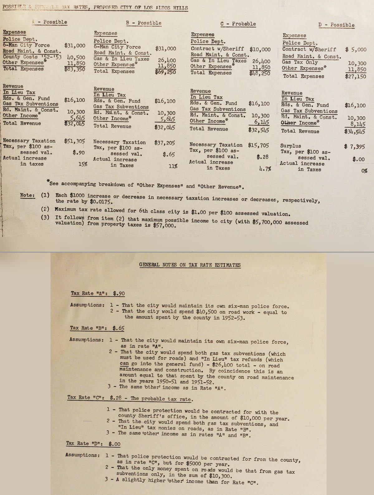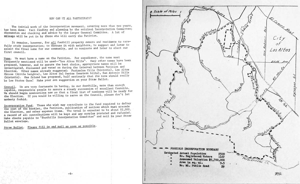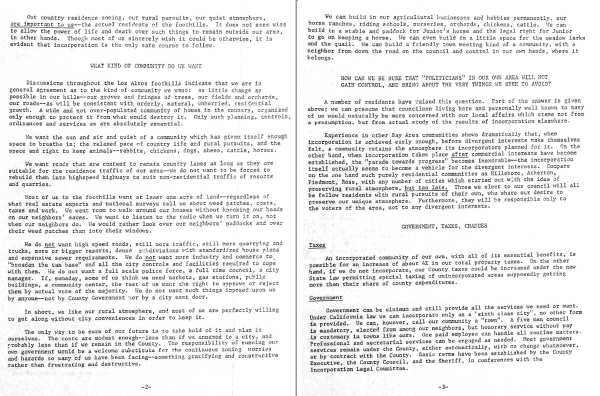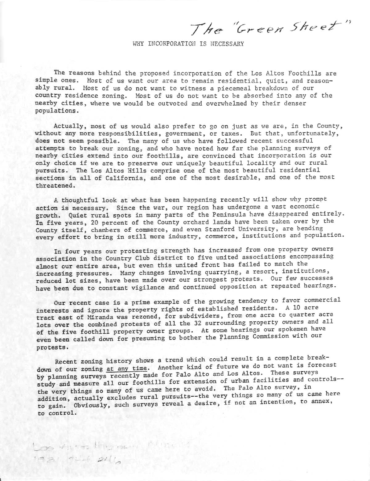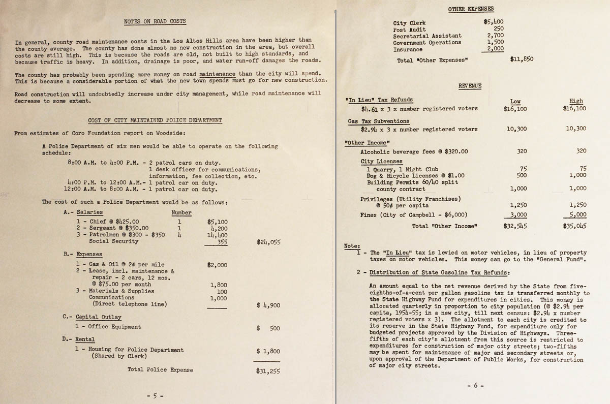 The resulting document became known as "The Green Sheets" and its six pages are shown below. Also shown on this web page (after the The Green Sheets) are a membership list showing the members of the committees (names marked with a *) as well as a wider selection of residents in each area who supported the movement as "Sponsors". Following that is shown the first known sketch marking the proposed boundaries of the new town to be called "Los Altos Hills". Finally there are some more documents that show the process used to determine a proposed budget and the level of tax rate that would be required to support it. This information needed to be figured out before the ballot as it was the critical deciding factor for many people. |