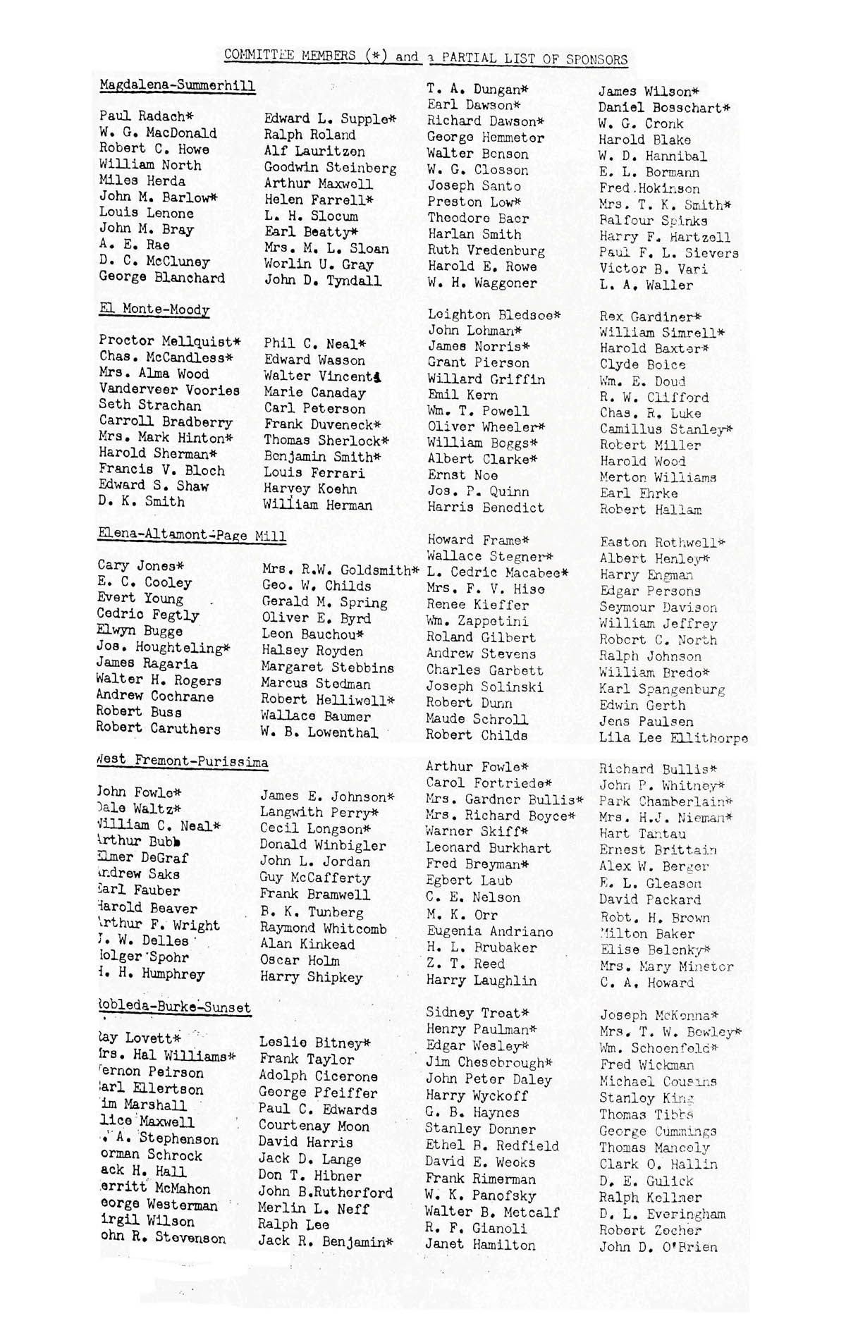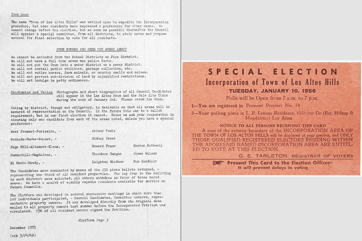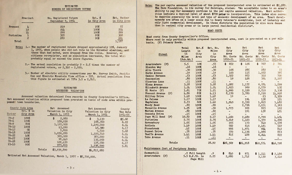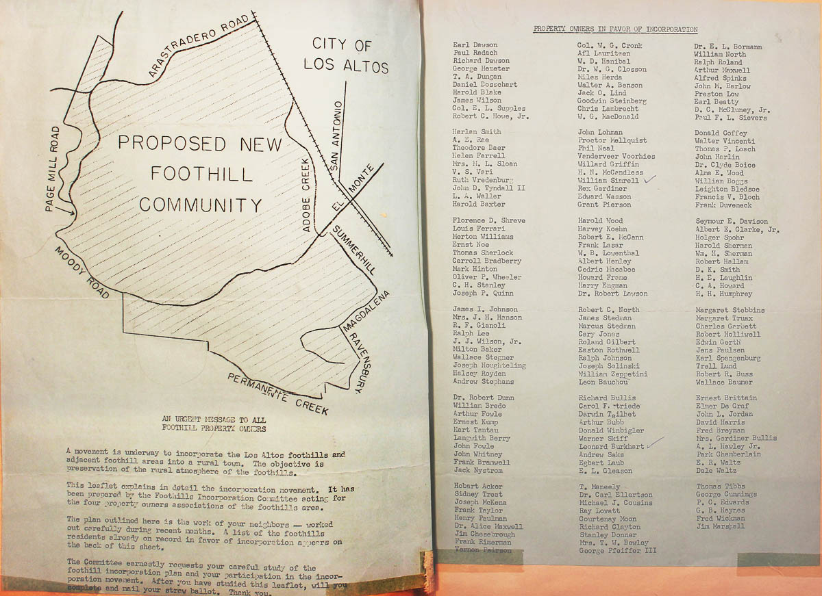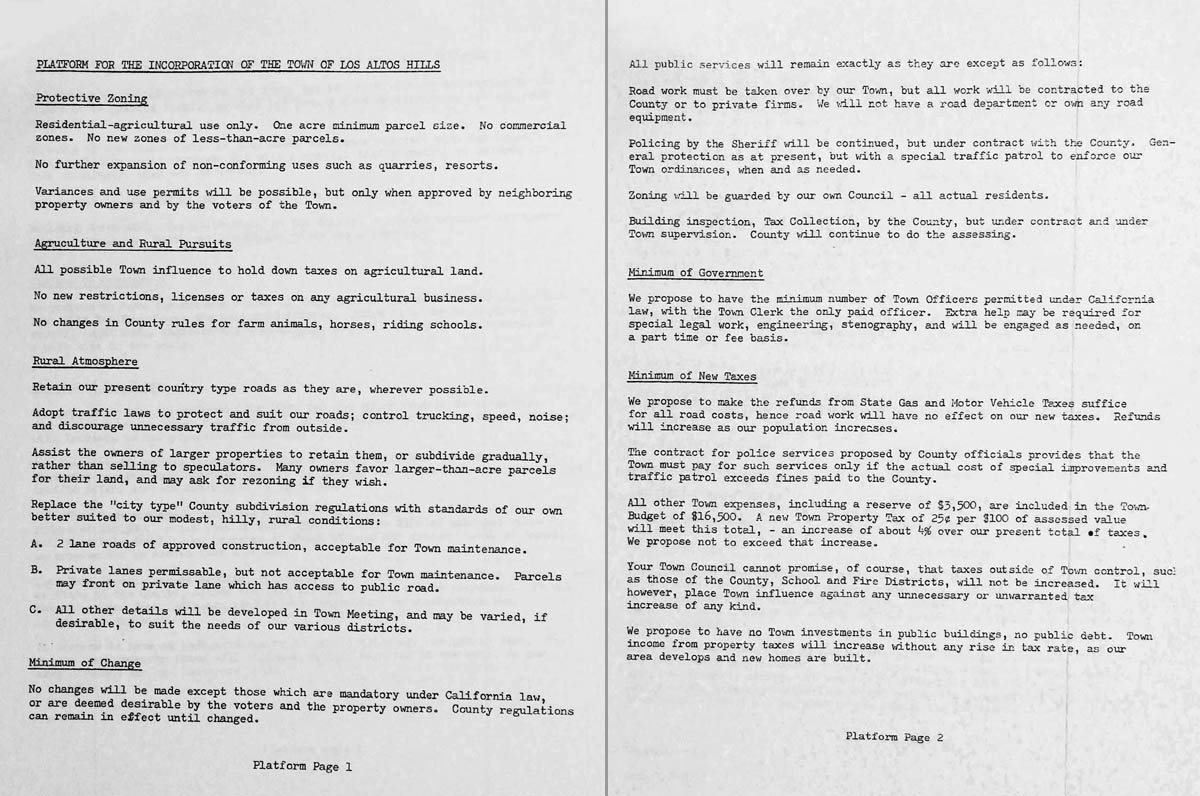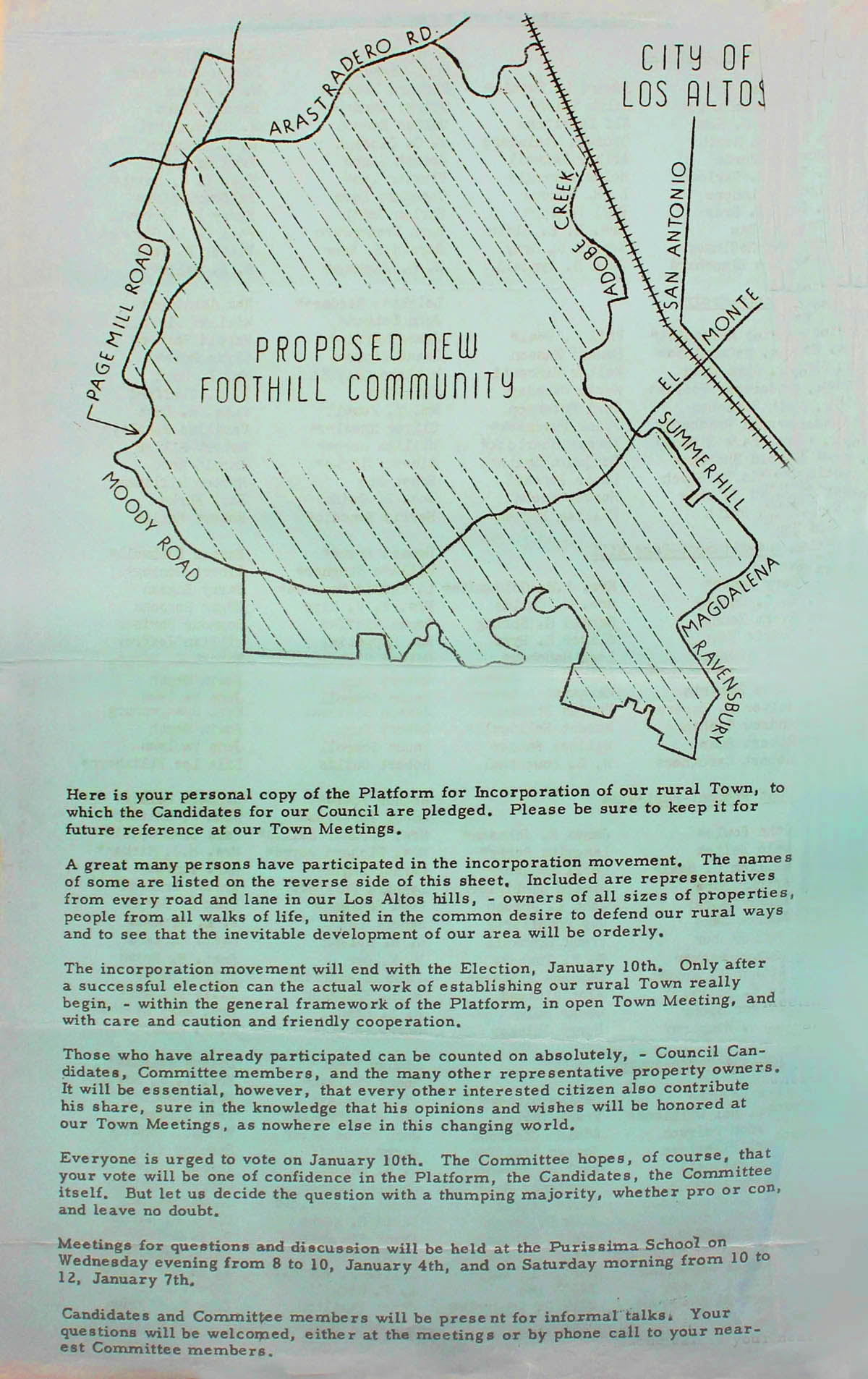 The resulting document became known as "The Green Sheets" and its six pages are shown below. Also shown on this web page (after the The Green Sheets) are a membership list showing the members of the committees (names marked with a *) as well as a wider selection of residents in each area who supported the movement as "Sponsors". Following that is shown the first known sketch marking the proposed boundaries of the new town to be called "Los Altos Hills". Finally there are some more documents that show the process used to determine a proposed budget and the level of tax rate that would be required to support it. This information needed to be figured out before the ballot as it was the critical deciding factor for many people. |