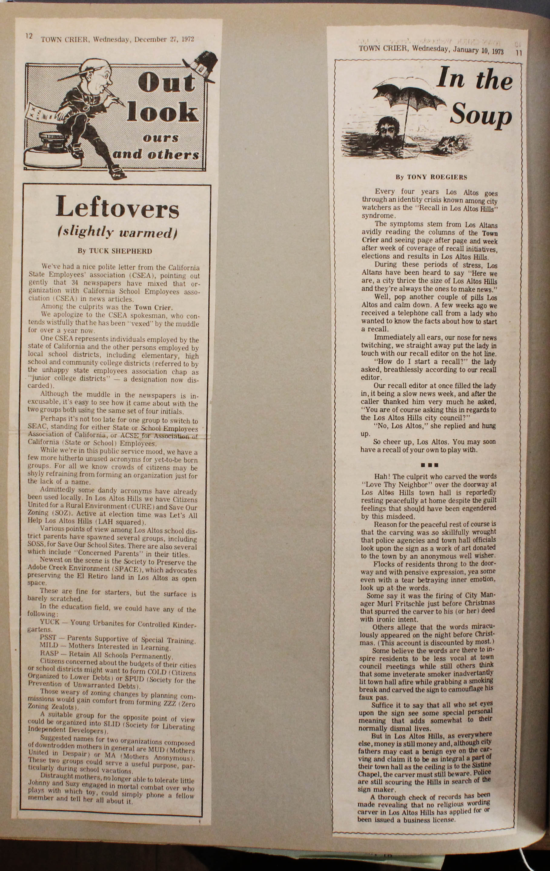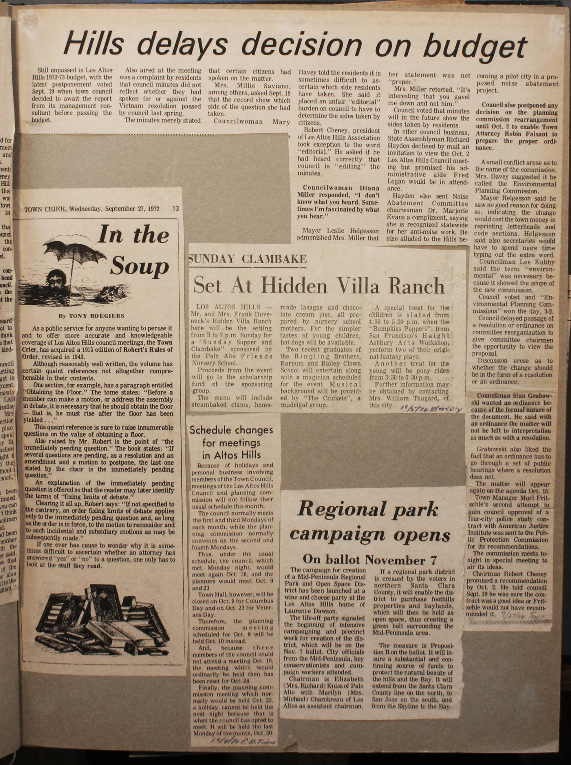 - "In the Soup" column about LAH and Roberts Rulesr - Clambake set at Hidden Villa - Schedule