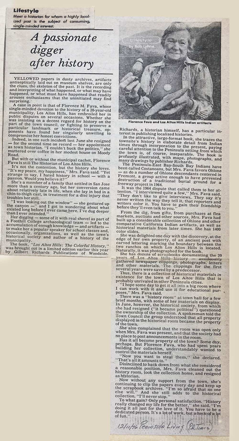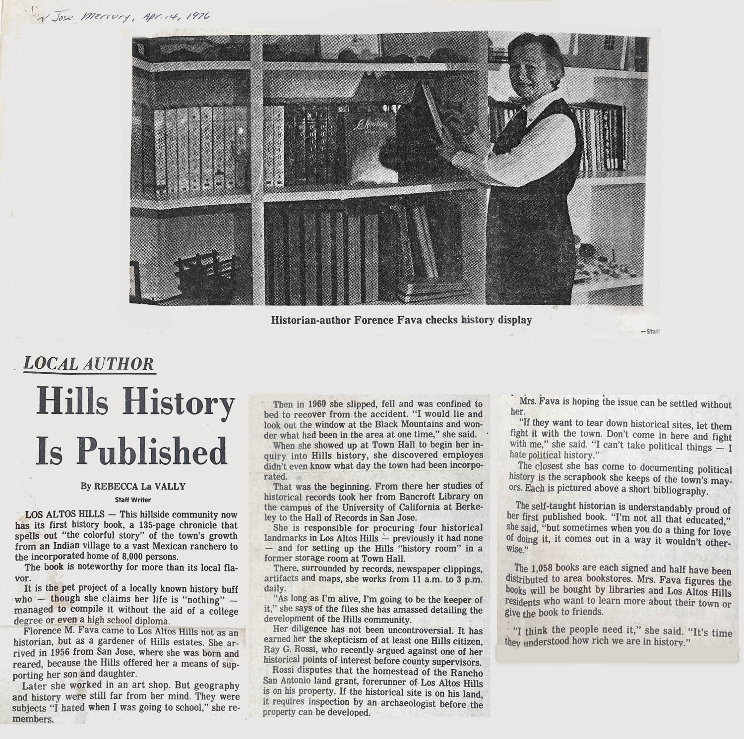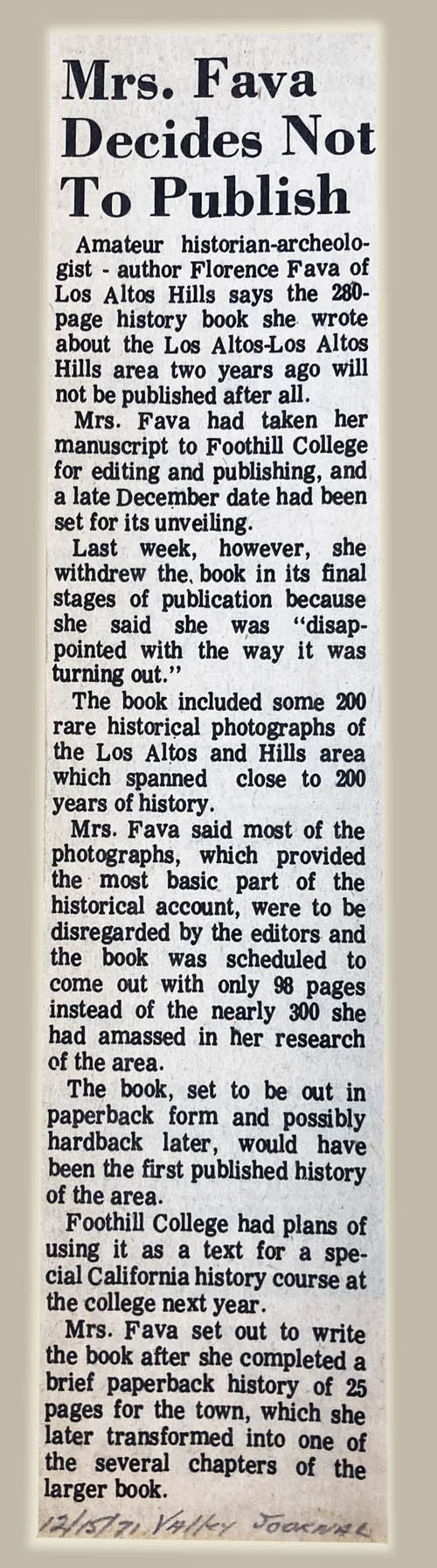 Florence Fava's Book did not appear spontaneously out of a vacuum. It was the side-product of a wider saga that involved a fair amount of friction and acrimony between the author (a volunteer historian) and other members of the community, as well as the staff of Town of Los Altos Hills. The book played just one role within a wider story. | |