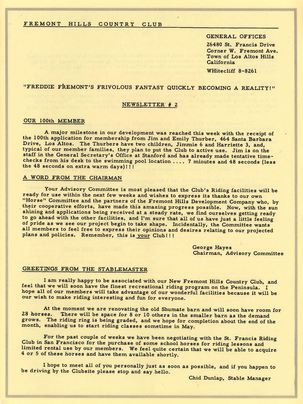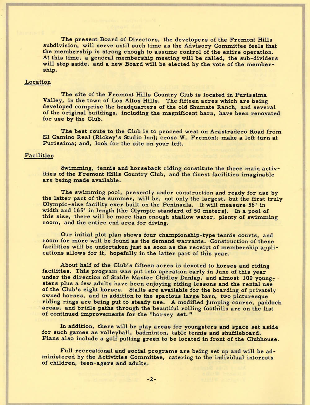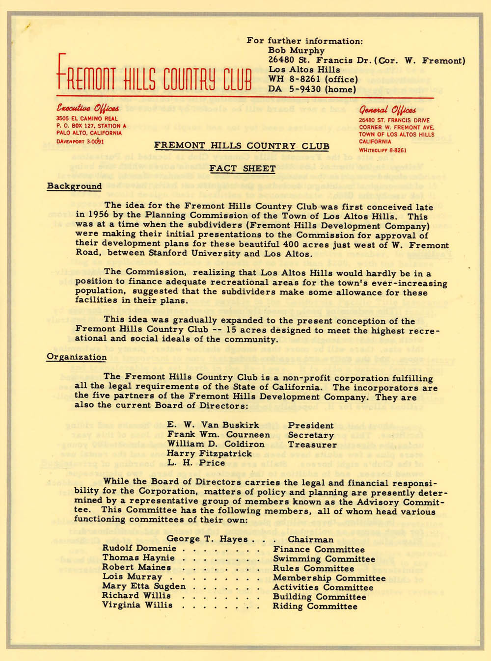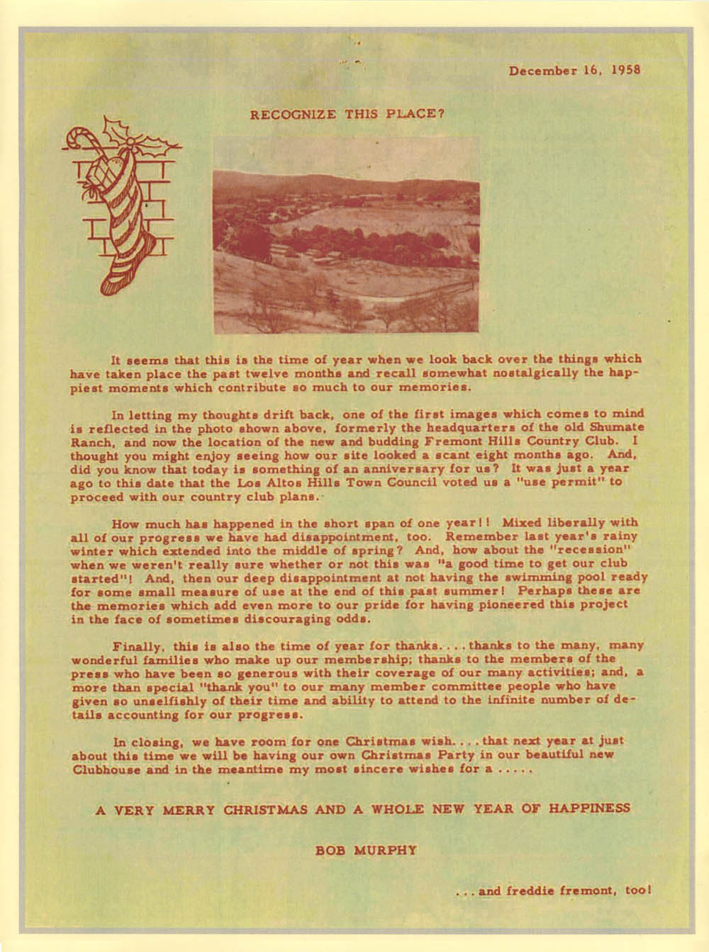 The Fremont Hills Country Club was set up and came into operation soon after the incorporation of the Town of Los Altos Hills.