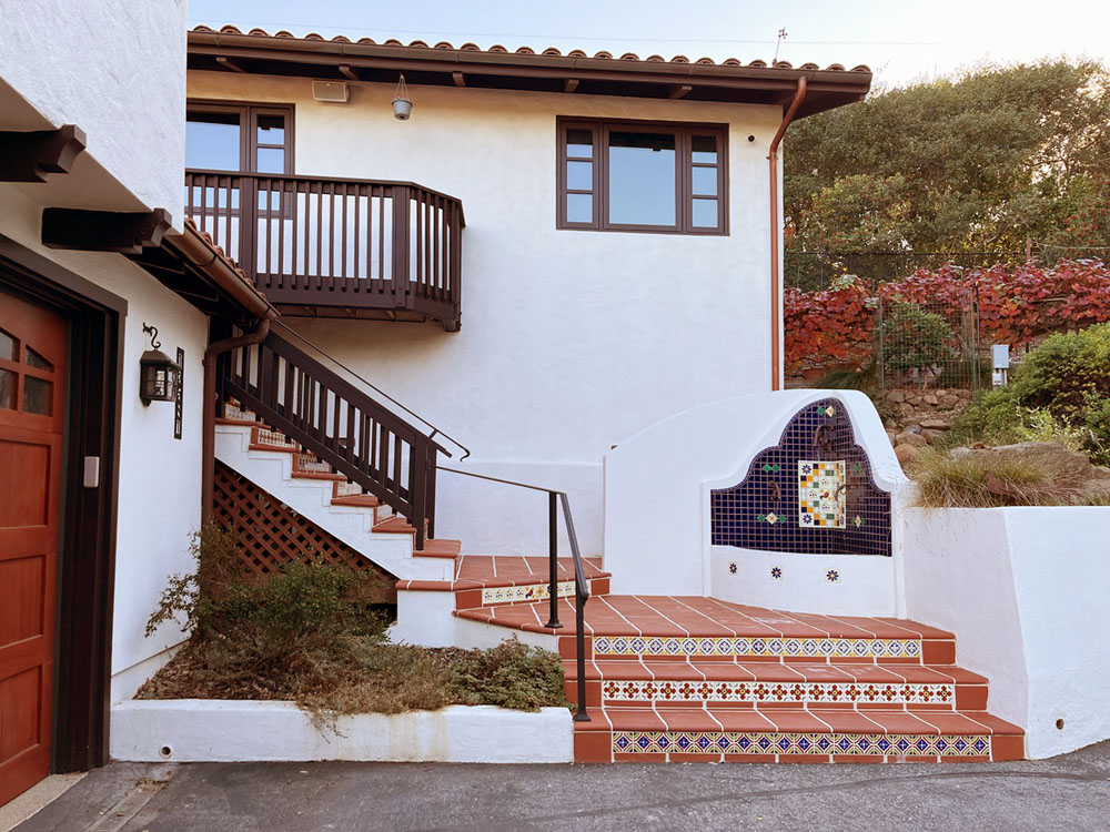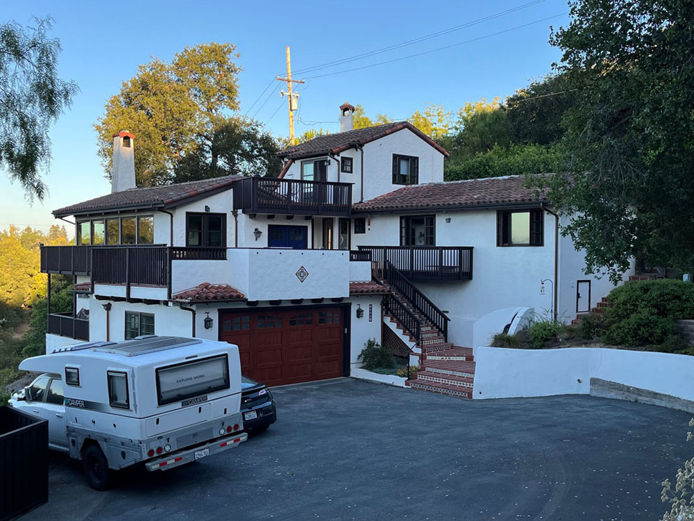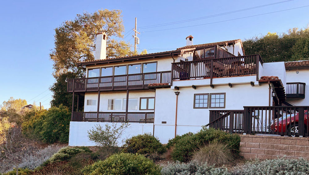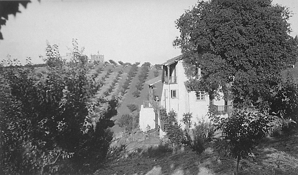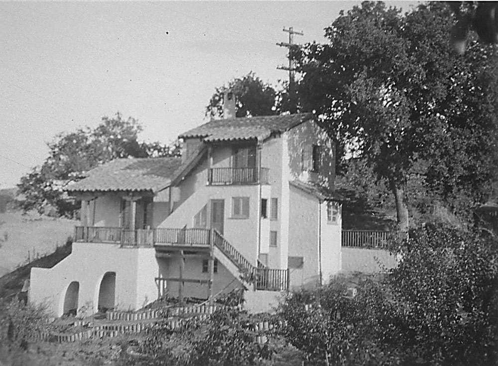 This view of the house is taken from an uphill position looking eastward down past the front face of the house and toward the orchards across Robleda.