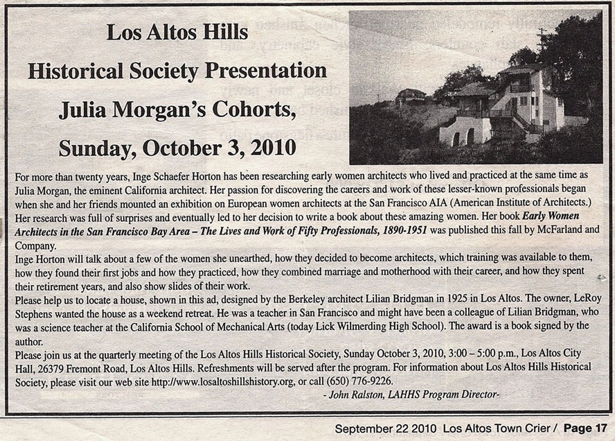Lilian Bridgman (1866-1948; science teacher in SF, poet, Berkeley architect) designed a Spanish-style two-bedroom “weekend
