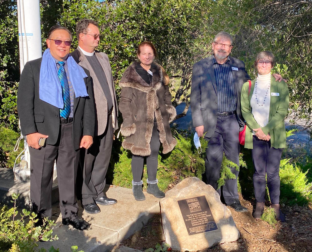 Together with members of The Church, a suitable site was chosen for the rock with the new plaque mounted on it, and on a sunny afternoon on December 17 2021, the plaque was rededicated in a small ceremony attended by some town residents and members of the Church community. |
