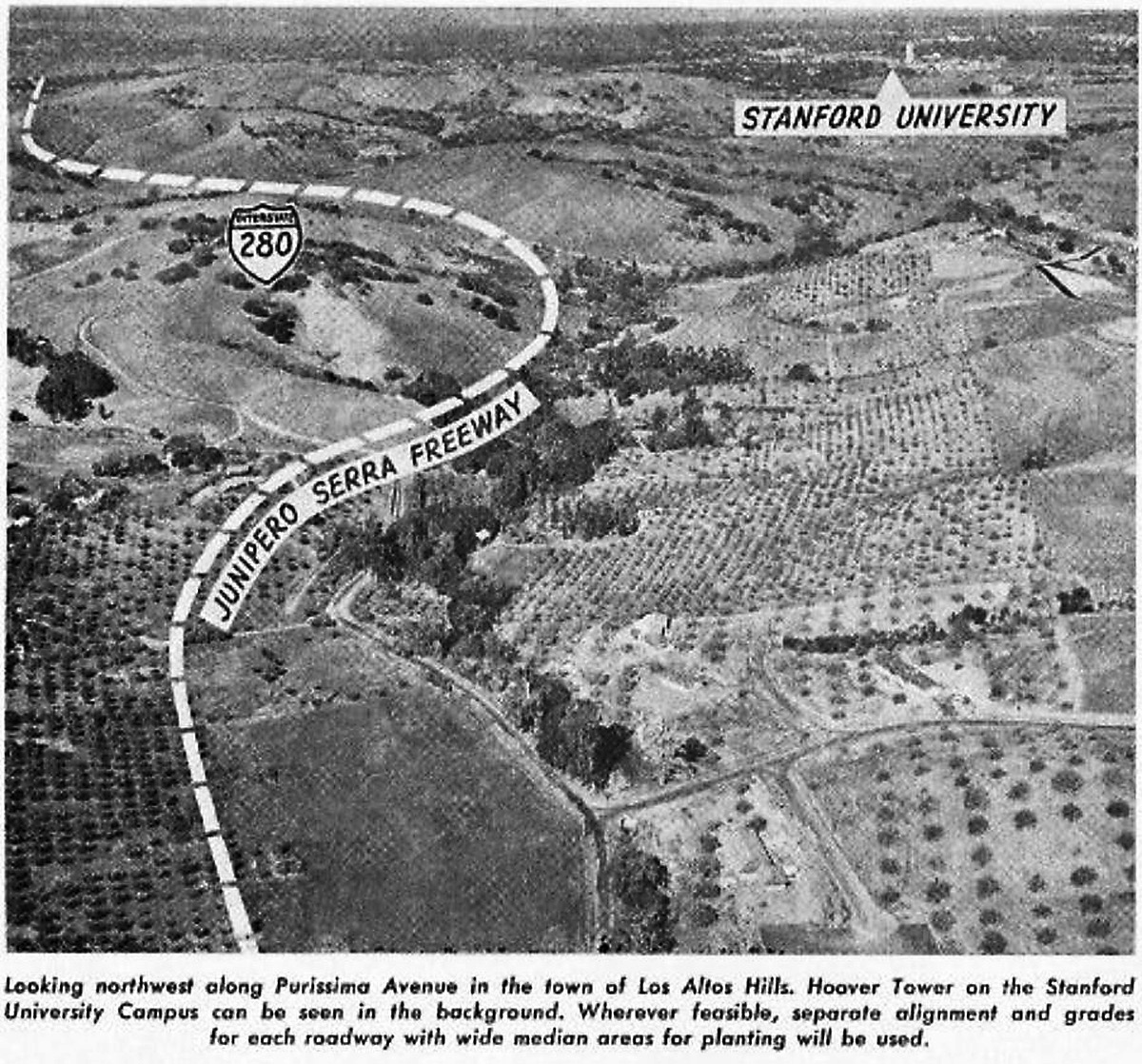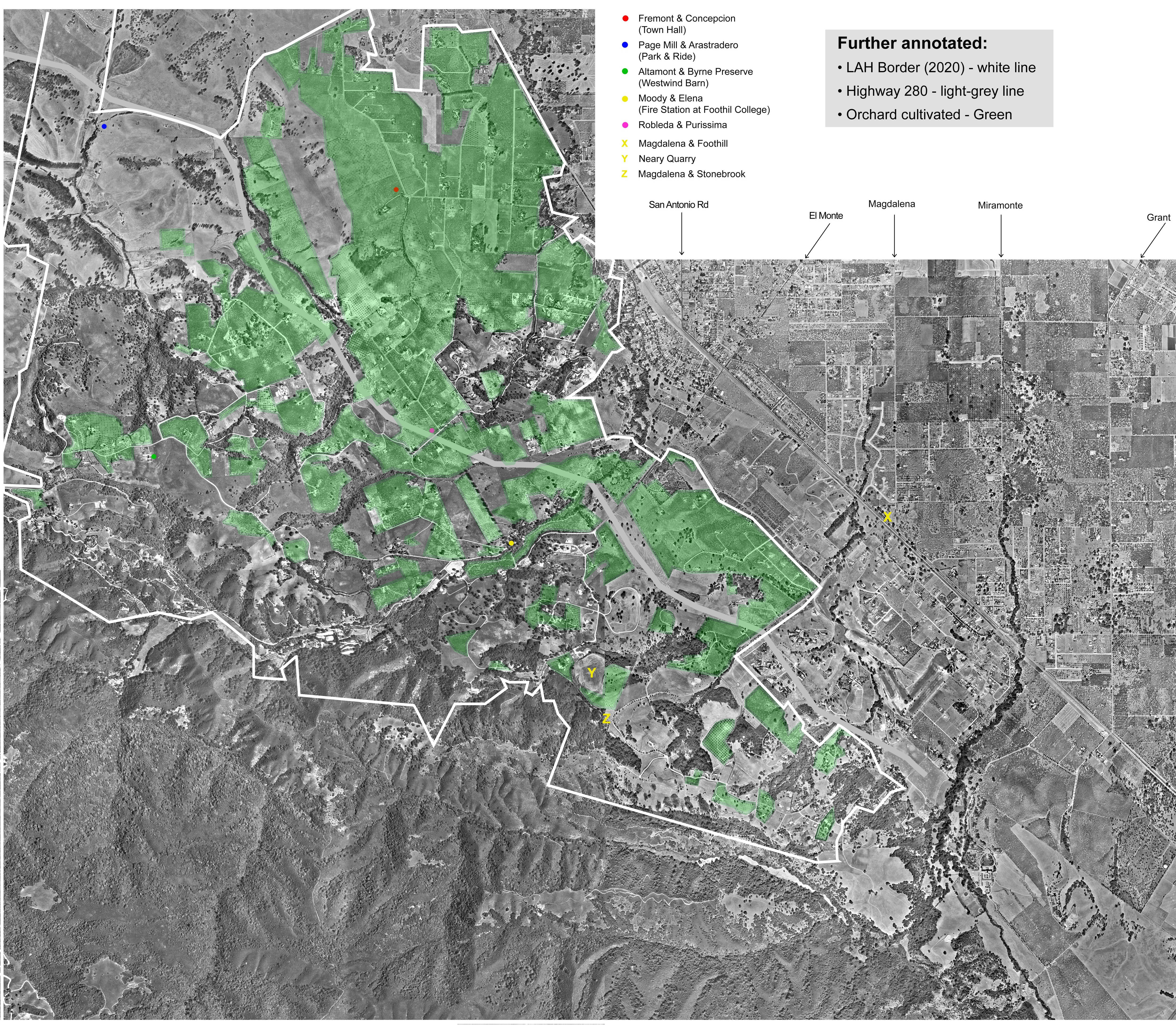 Aerial photo of Los Altos Hills - same as previous (lower resolution) with notation added showing Town Border, Highway 280 and Area in cultivation as orchards) |