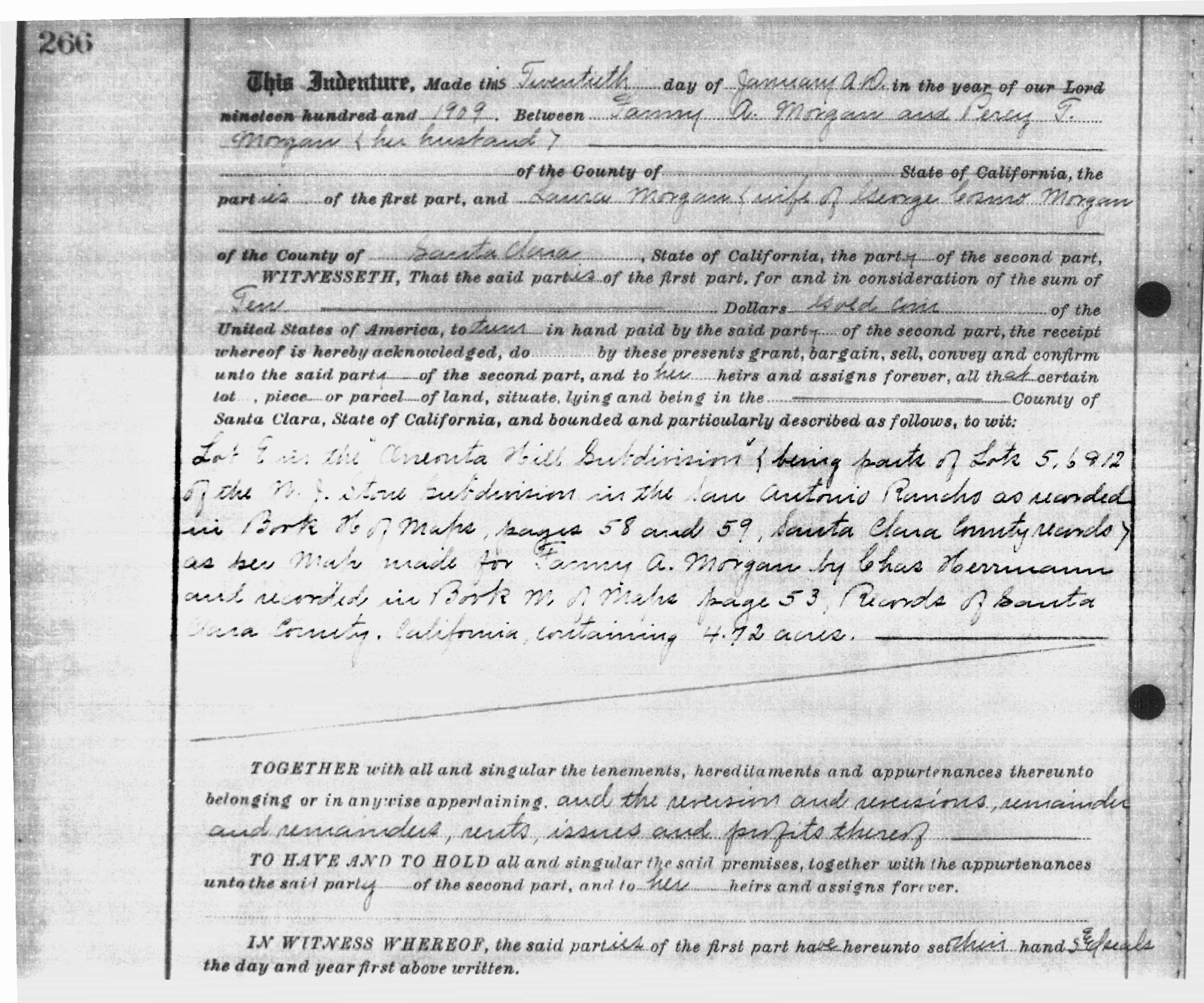 Contract where Fanny and Percy Morgan sell lots 5,6,12 of the Oneonta sub-division to Laura Morgan (wife of Cosmo Morgan) for $10 in gold coin |