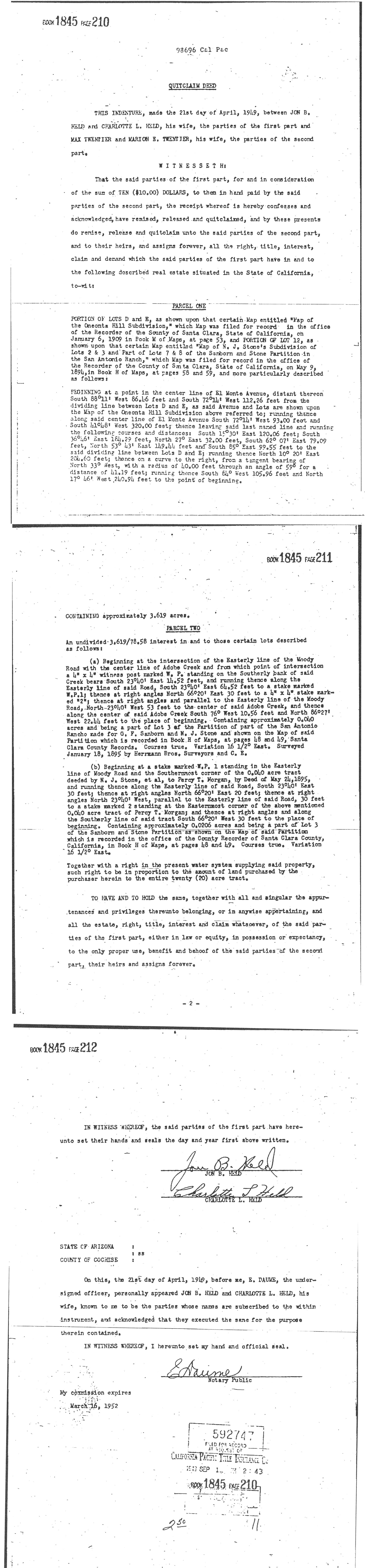 Contract (Quitclaim deed) where John and Charlotte Held sell two parcels in the Oneonta sub-division to Max and Marion Twentier for $10 in hand |