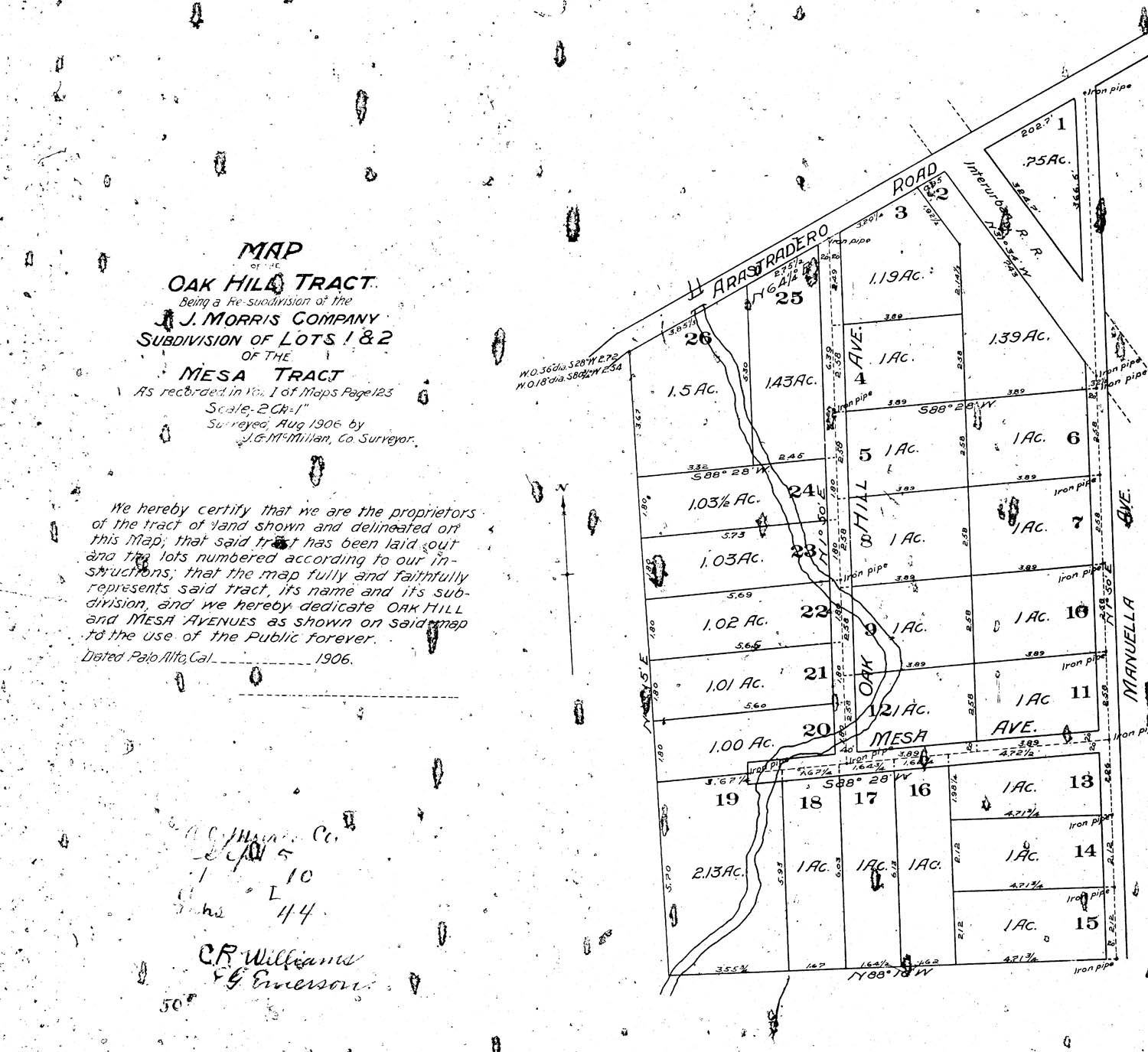 end of thee Mesa Tract where it abuts Arastradero Road and the planned route of the Interurban Railroad, which later became Foothill Expressway |