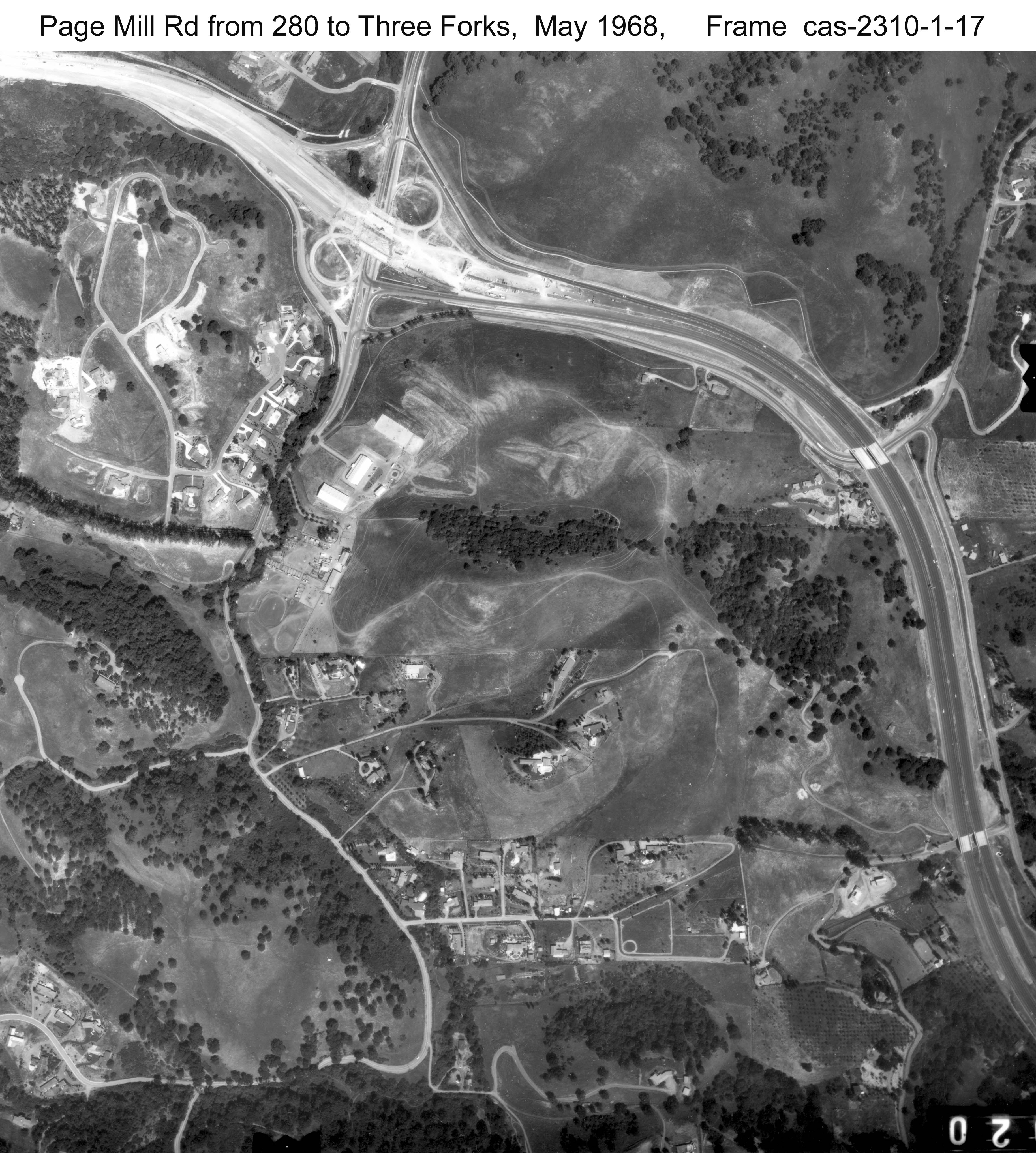 Aerial of the section of Page Mill Road between 280 (where the intersection is under construction) and Three Forks Lane (Large file - click on image to zoom in) |