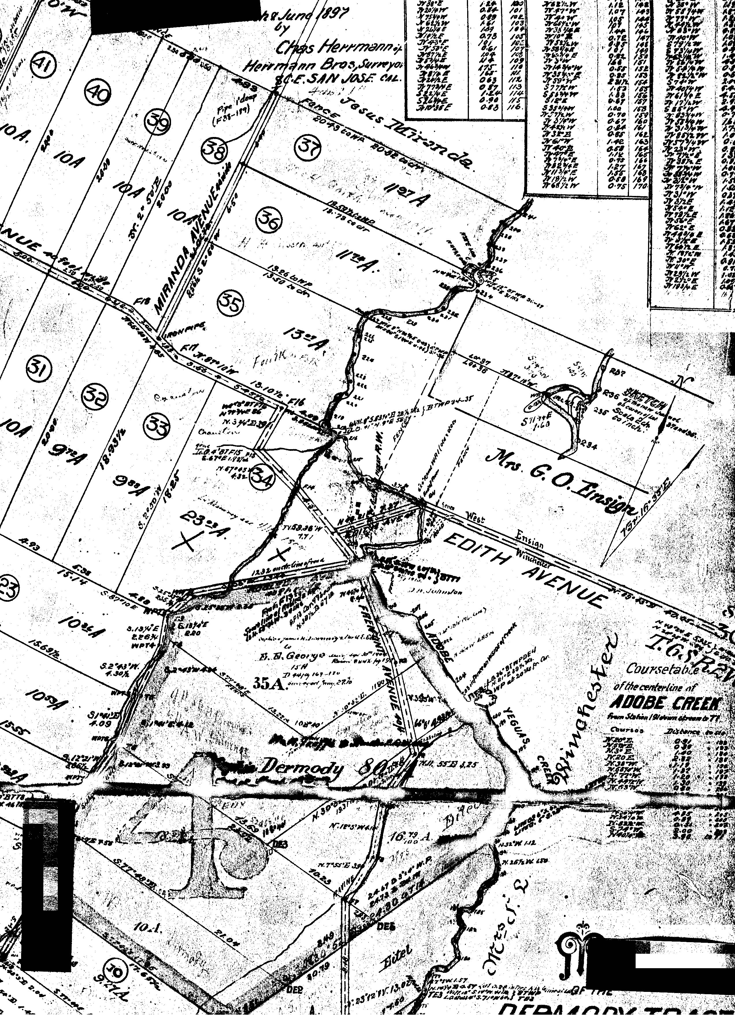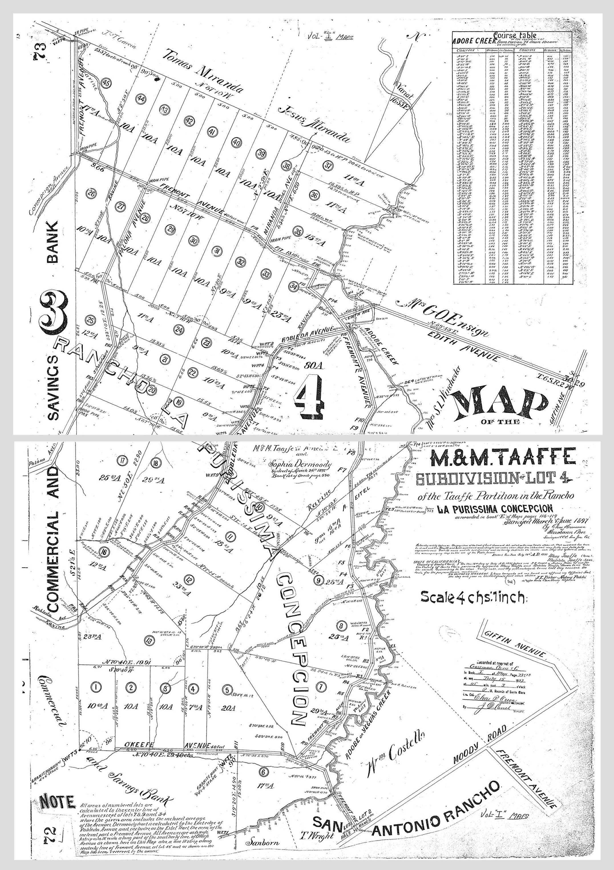 Map of subdivision of parcel 4 of the Taaffe Partition, recorded 7/15/1897 (around where Adobe Creek encounters original Edith Avenue) |