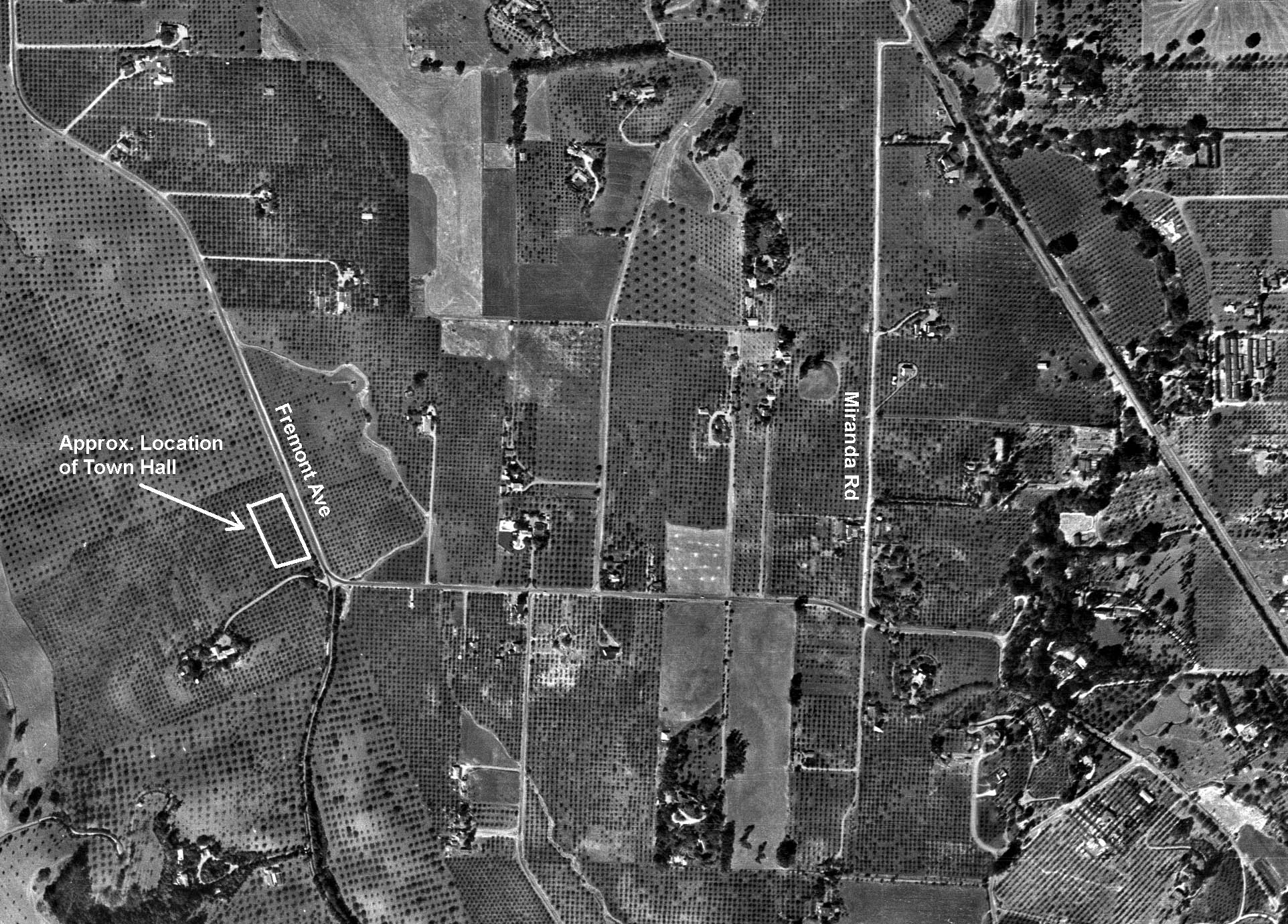 Aerial photo of Town Hall Neighborhood believed to have been taken around 1947 (from California Aerial Survey) |
