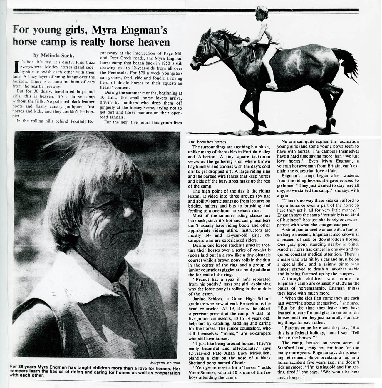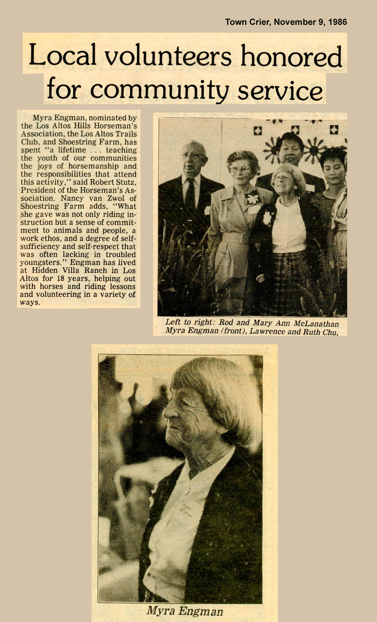 Myra Engman was an early teacher of horsemanship to countless youngsters growing up in the hills or attending a camp run by her on Stanford land or at Hidden Villa.