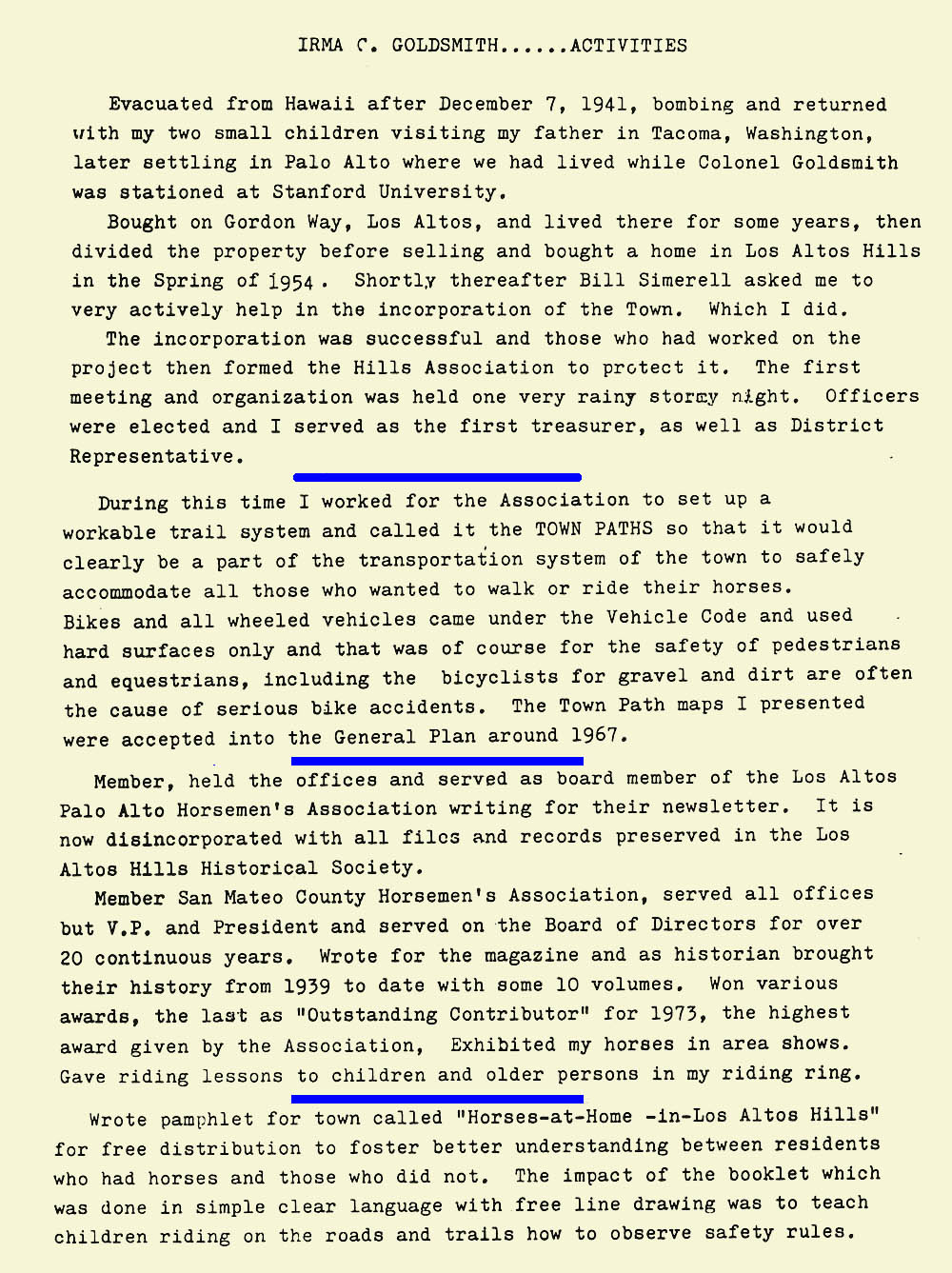 In July 1957, a Mrs. Goldsmith filed a proposal for a series of bridle paths that would meander through Los Altos Hills, along with a map depicting her vision as the town pathways chairwoman. This wasn't a new idea. The issue had been incorporated into the platform establishing the new town and, more obviously, someone had gone to the trouble of appointing Mrs. Goldsmith to her position as chairwoman.