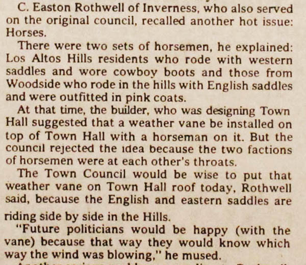 In June 1977 a re-union meeting of the Town’s founders was held, and in a news report (Palo Alto Times of 5/27/77) we read the following: