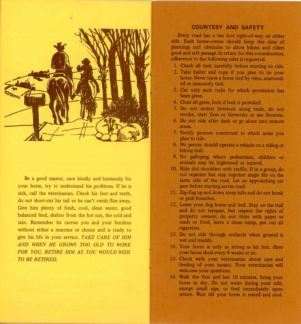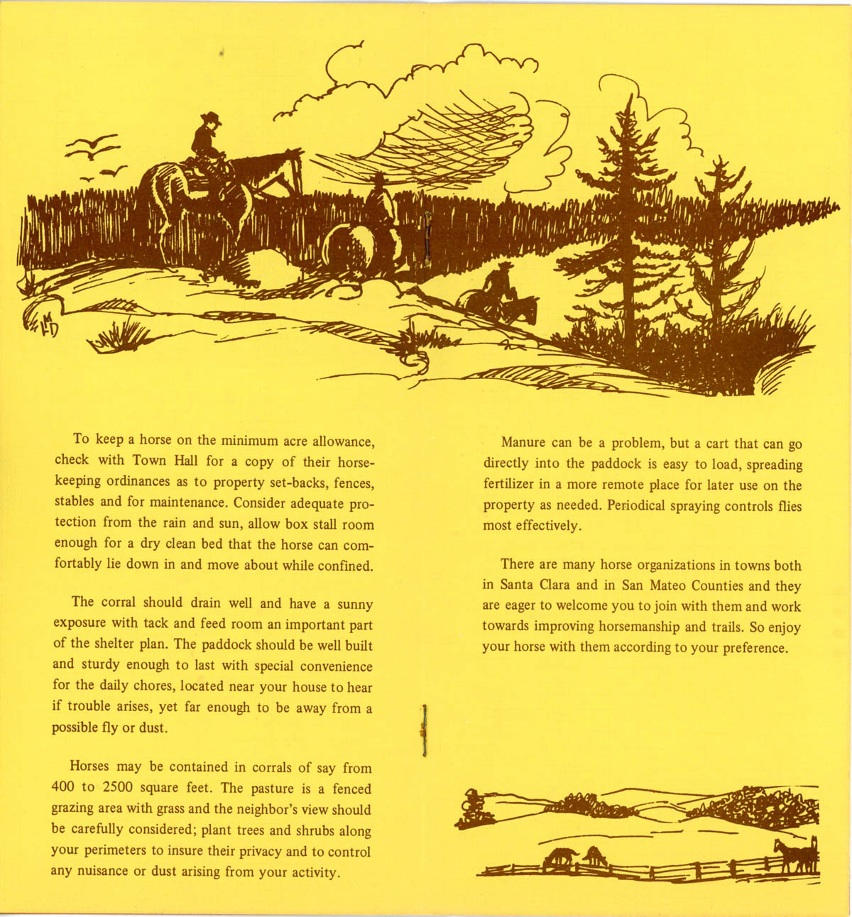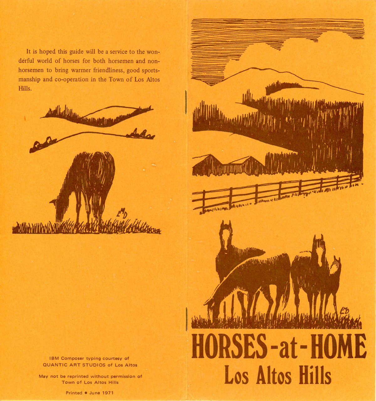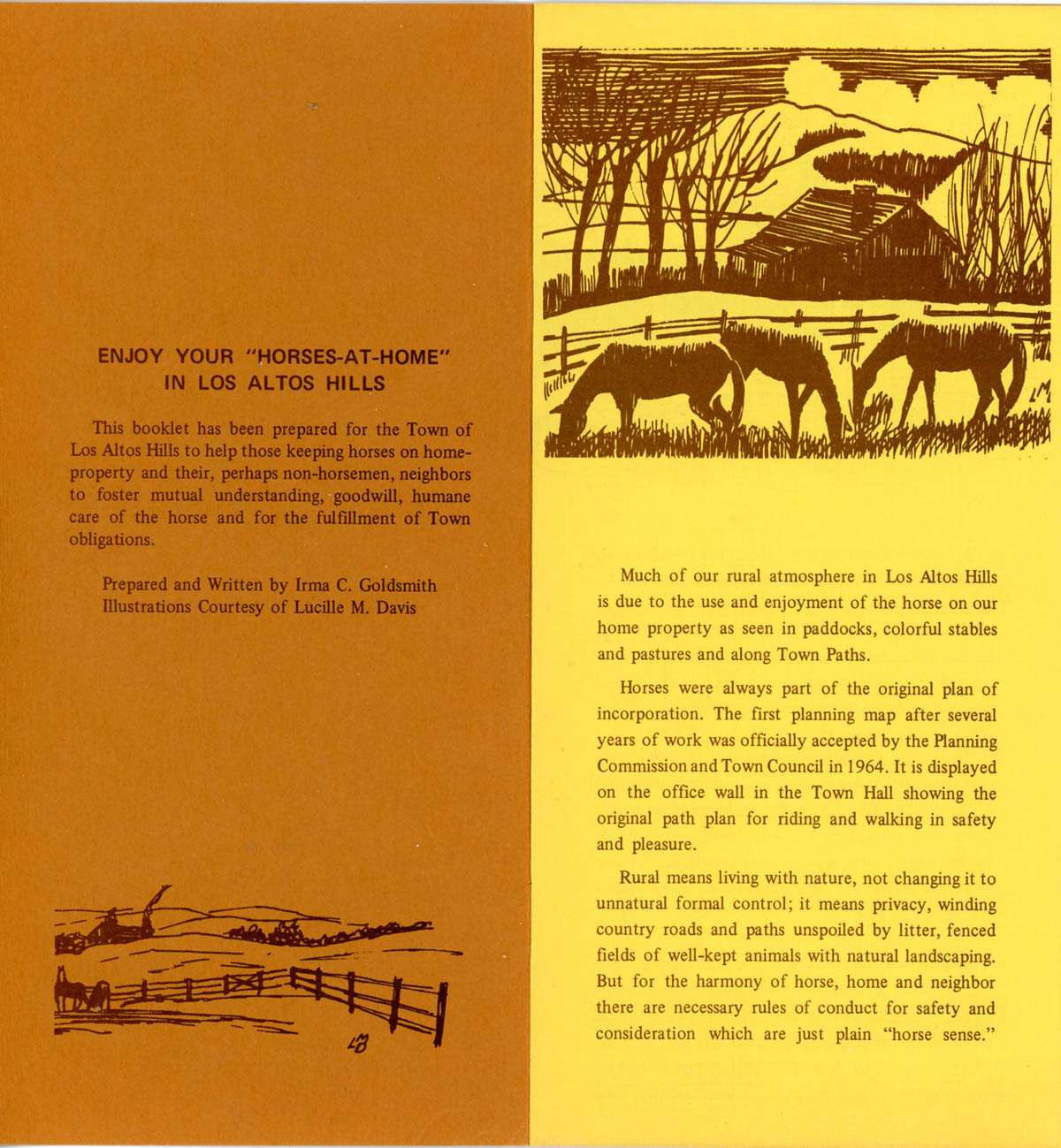In 1971, soon after the founding of the Los Altos Hills Horsemen's Association in the previous year, Irma Goldsmith created this booklet as a handout available for residents at Town Hall. Intended for Horsemen,