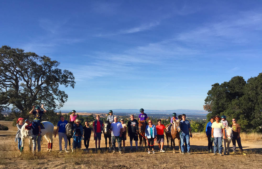 Jim Forderer, founding Instructor for the program, together with three of his adopted children and Bernice Hogan, (behind), an early volunteer who provided her horse for use in the program