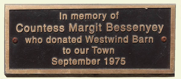 The plaque is very brief. All it tells us, is that The Countess Margit Bessenyey donated Westwind Barn to the Town in 1975 – but behind this hides a colorful history