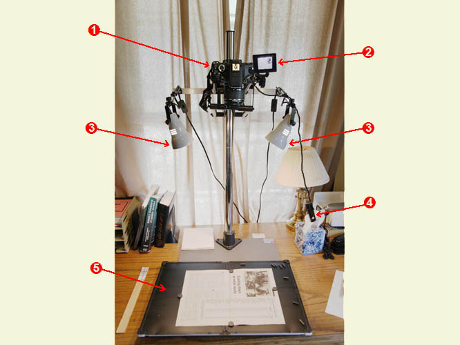 The camera ➊ is mounted on the copy stand at a height such that the mid-rang of the zoom on the lens (the sweet spot) takes in approximately a page of the typical scrapbook size.