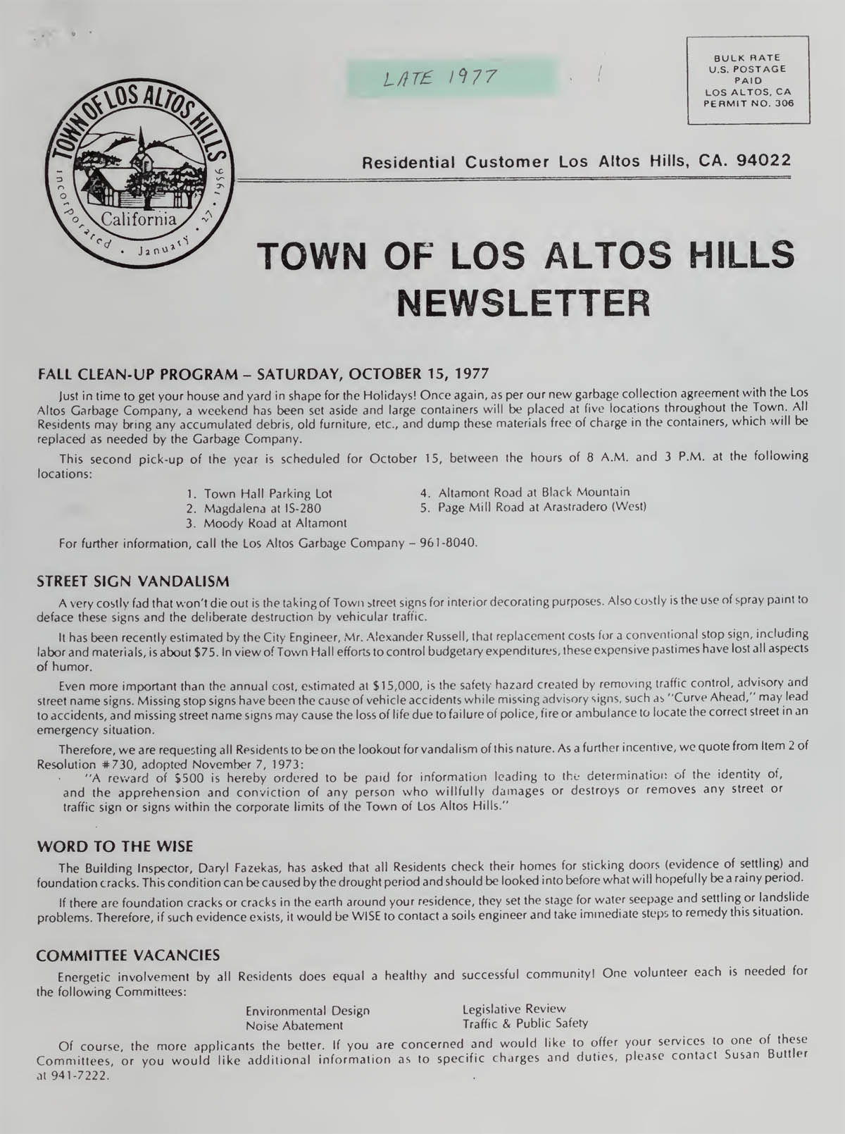 Fall clean-up program, Street-sign vandalism, Word to the wise about buildings settling, committee vacancies advertised |