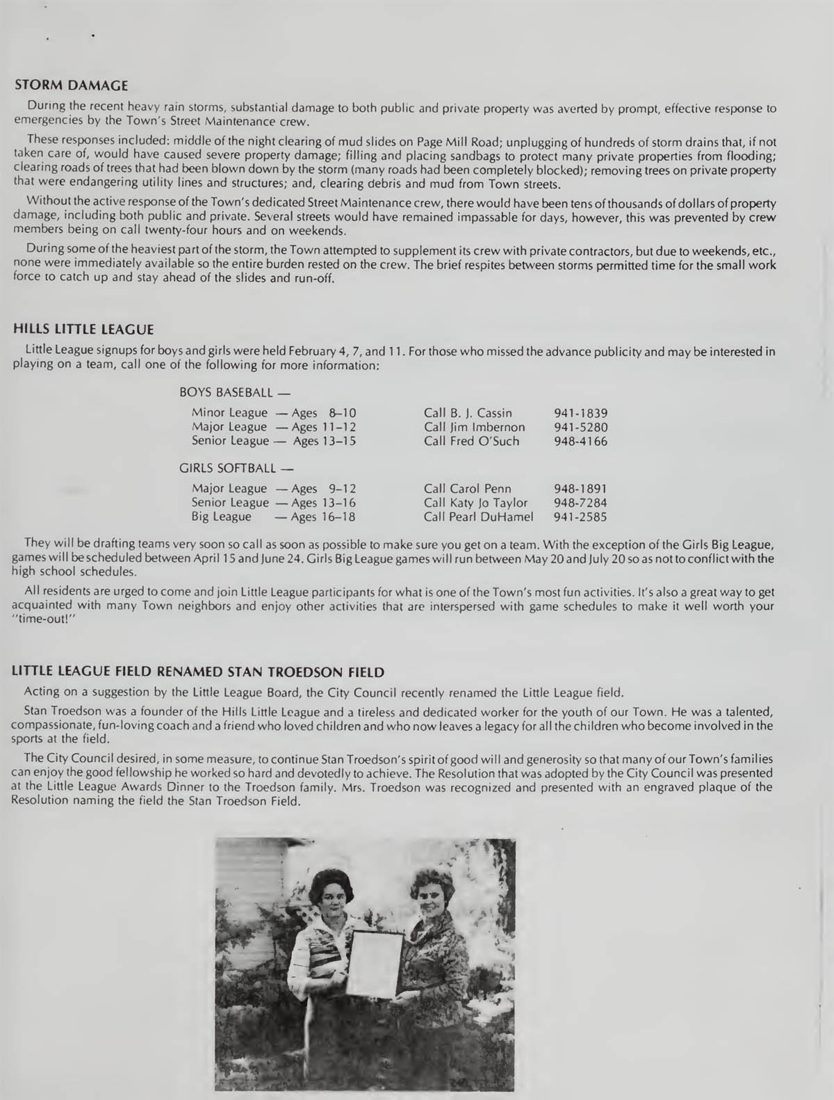 Storm damage, Little League, Little League Field named Stan Troedson Field |