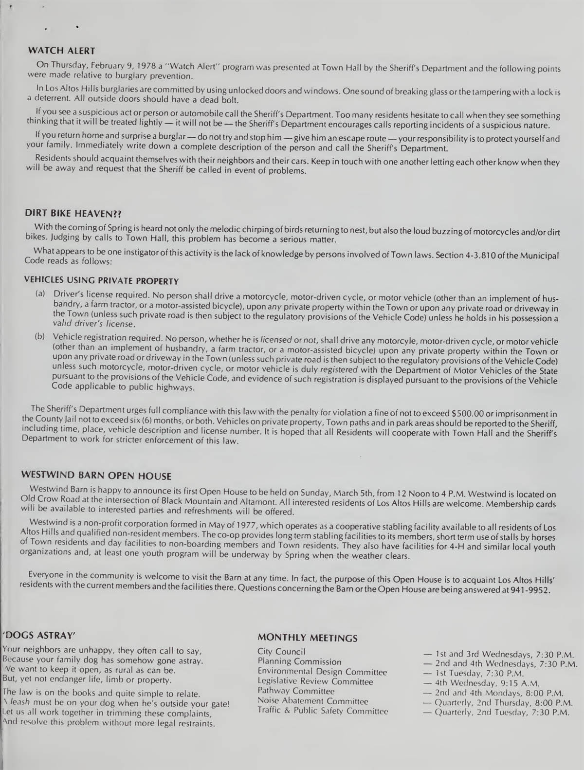 Watch Alert, Dirt Bike Heaven, Rules for vehicles using private property, Westwind Barn Open House, Dogs astray, Schedule of Town Meetings |