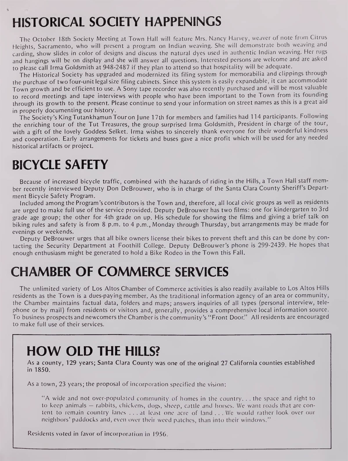Historical Society Happenings, Bicycle Safety, Chamber of Commerce Services, How Old The Hills? |