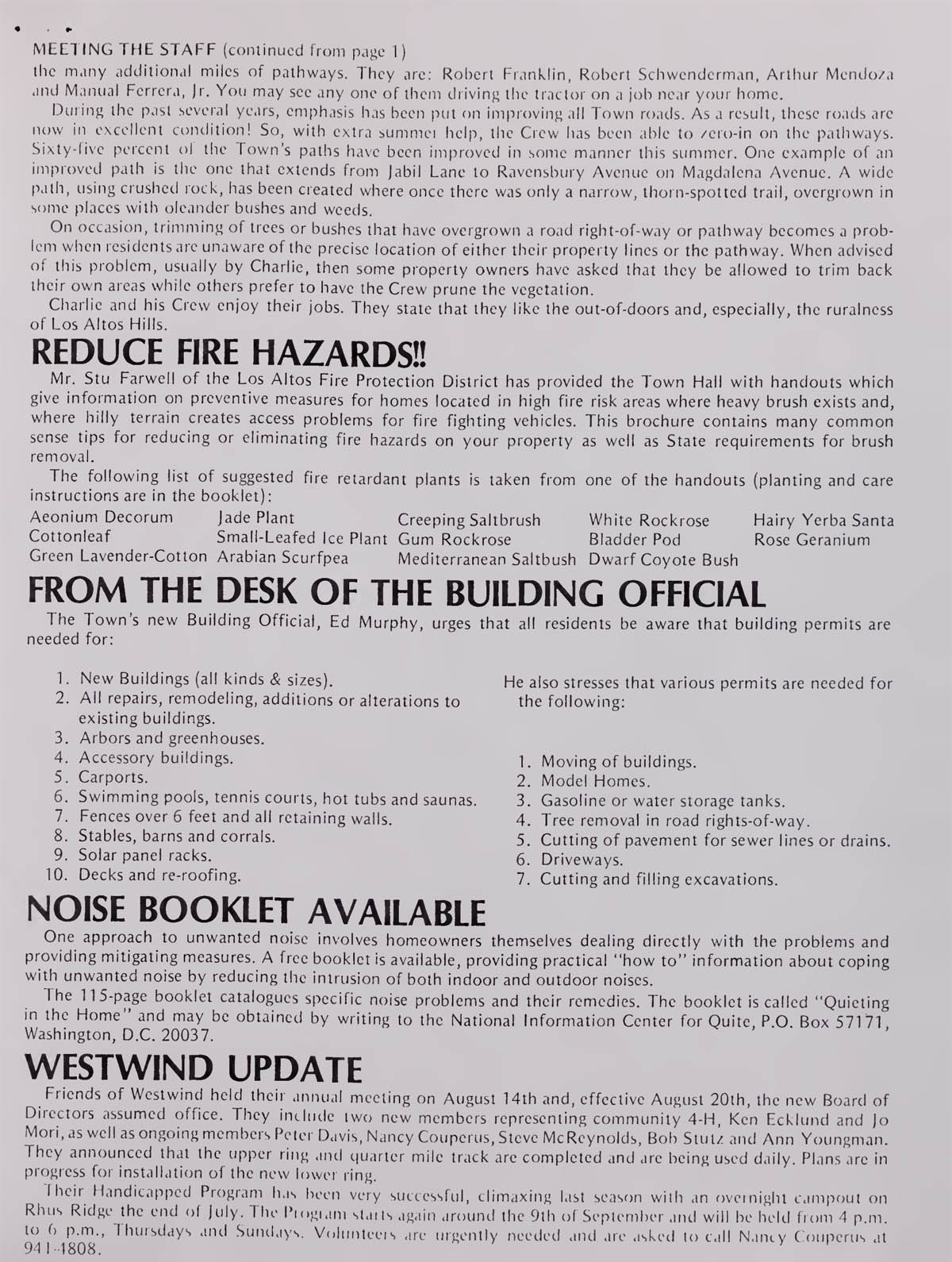 Reduce Fire Hazards, From the desk of the Building Official, Noise Booklet available, Westwind Update - new Board of Directors. |