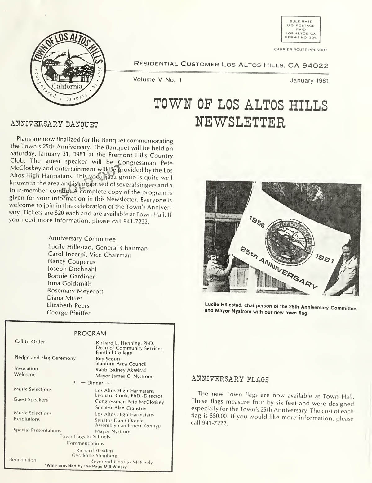 Anniversary Banquet - sold out! ♦ Program for Anniversary Banquet ♦ Hillestad & Nystrom showing new town flag ♦ new Town Flags