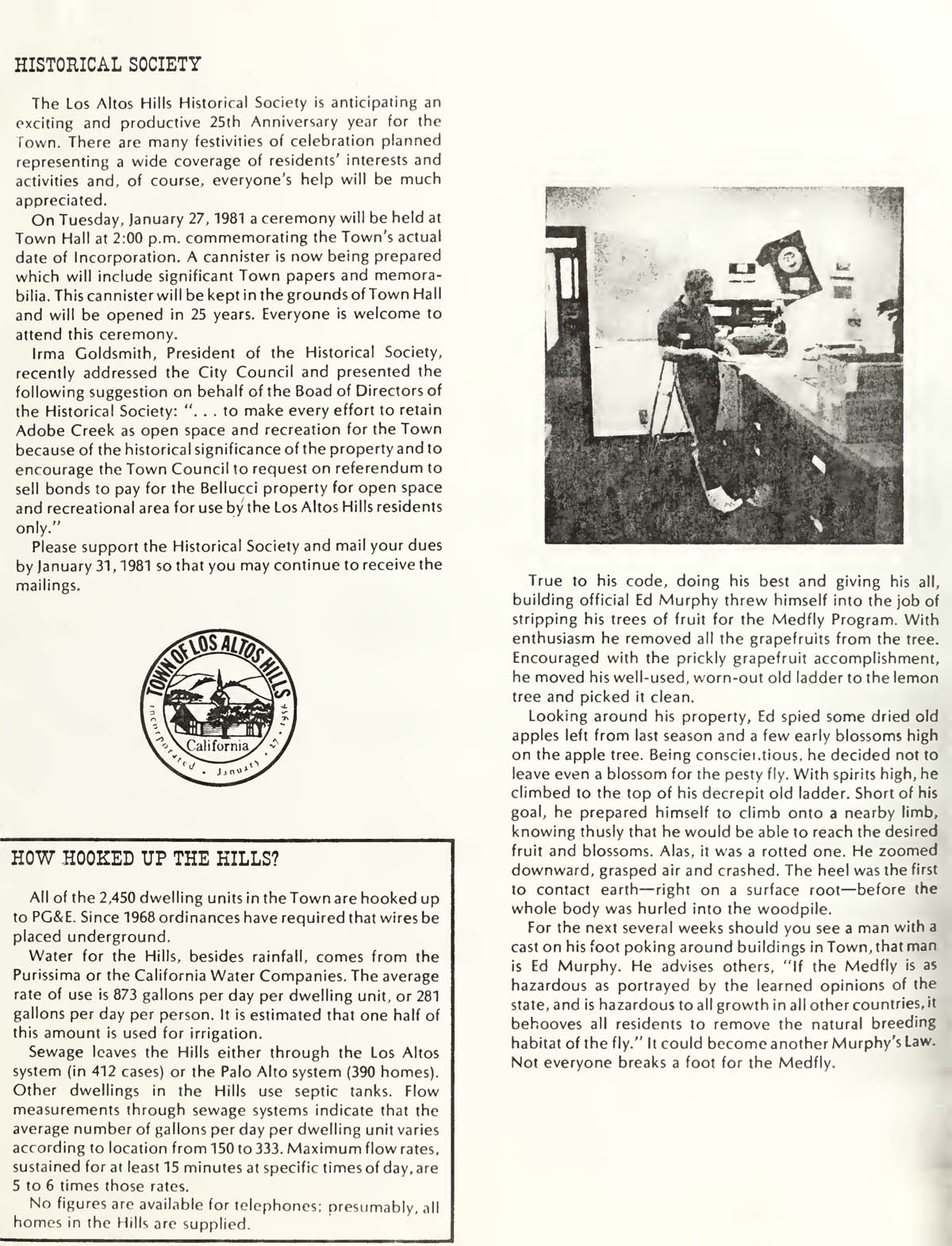 Historical Society Happenings ♦ How hooked up the hills? ♦ Town Building Official Ed Murphy injured while stripping fruit from trees for Medfly Program |
