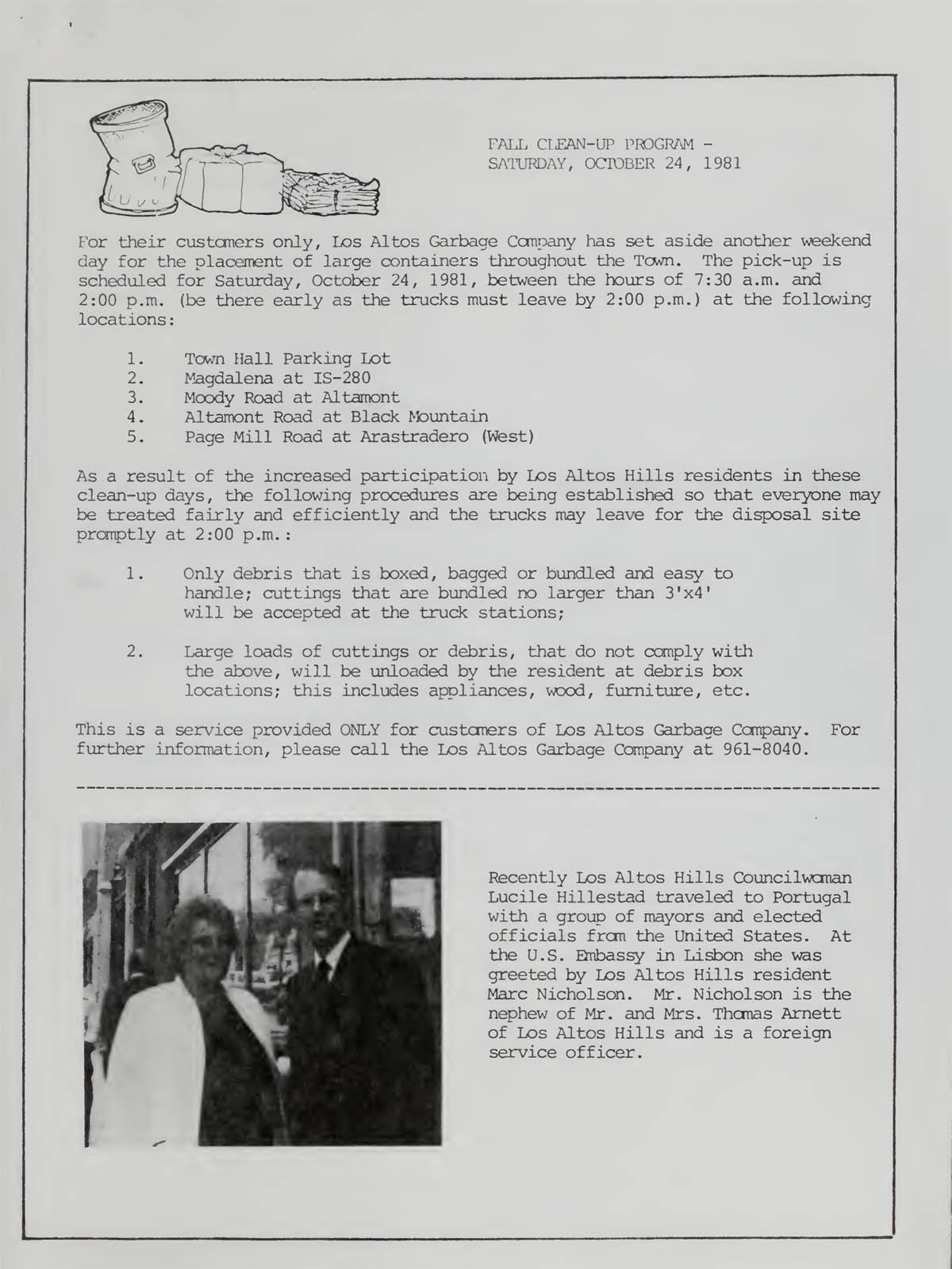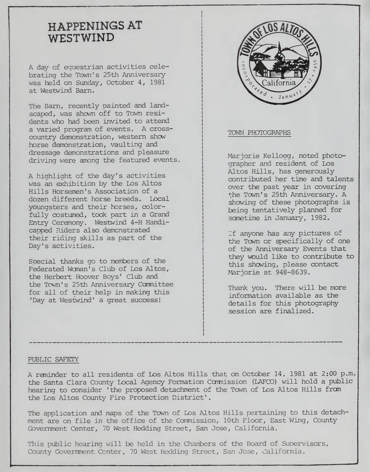 Westwind Happenings, Town photographs solicited by Kellog about 25th town anniversary, Reminder about LAFCO meeting on Public Safety for LAH |