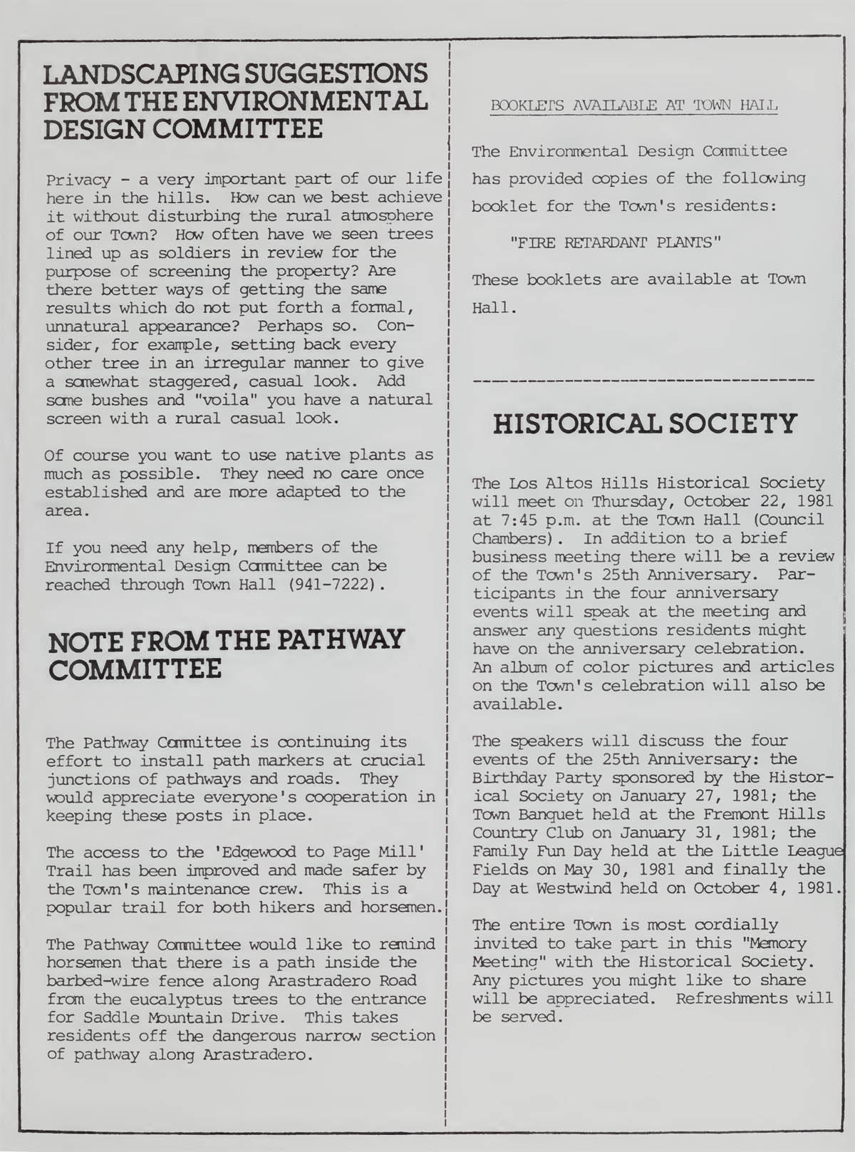 Landscape suggestions from Environmental Design Committee, Note from Pathway Committee, Booklets avaialble from Town Hall, Historical Society Happenings |
