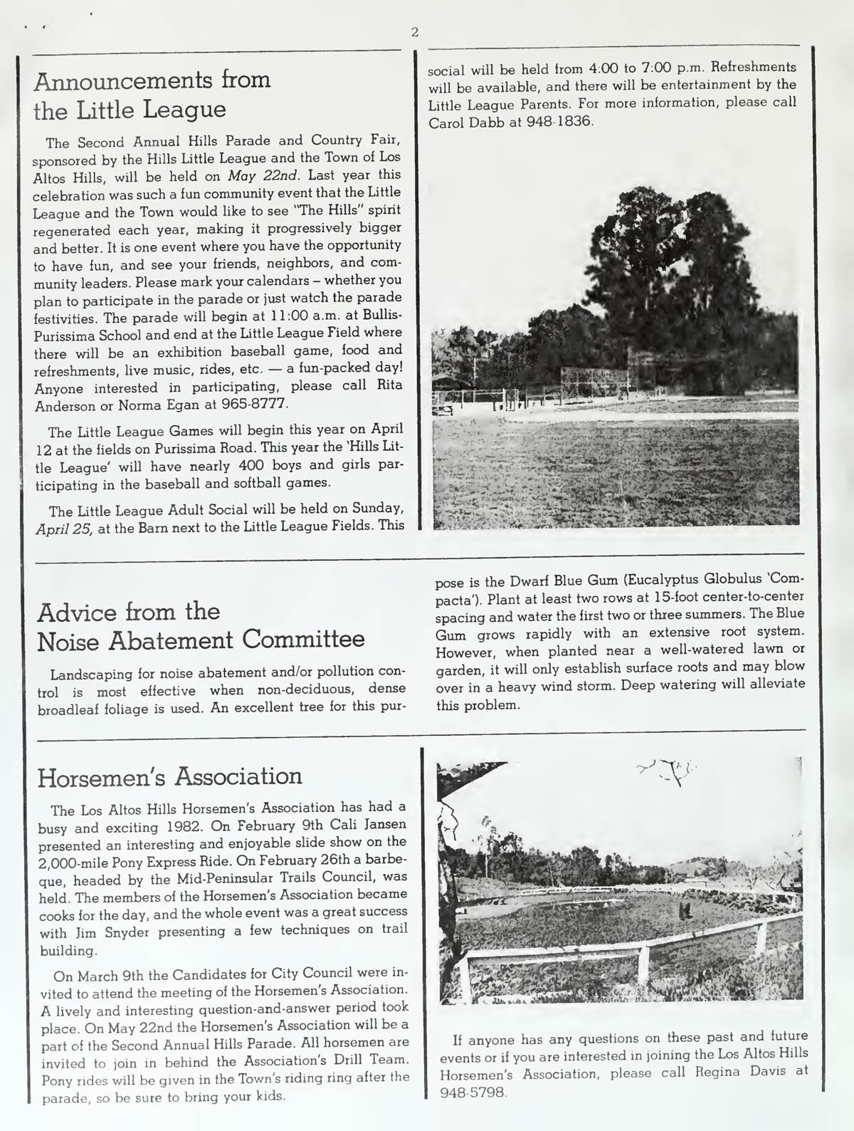 Little League announces Parade and County Fair events, Noise Abatement Committee advises Eucalyptus for noise and pollution control,