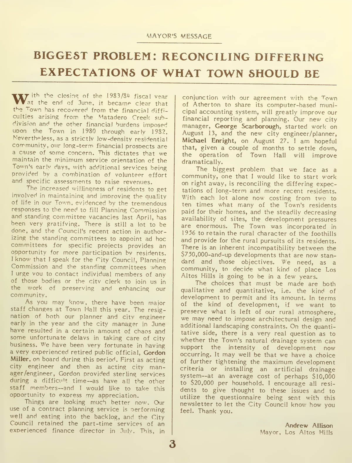 Mayor Allison's Message - Biggest problem is reconciling differing expectations of what town should be. |