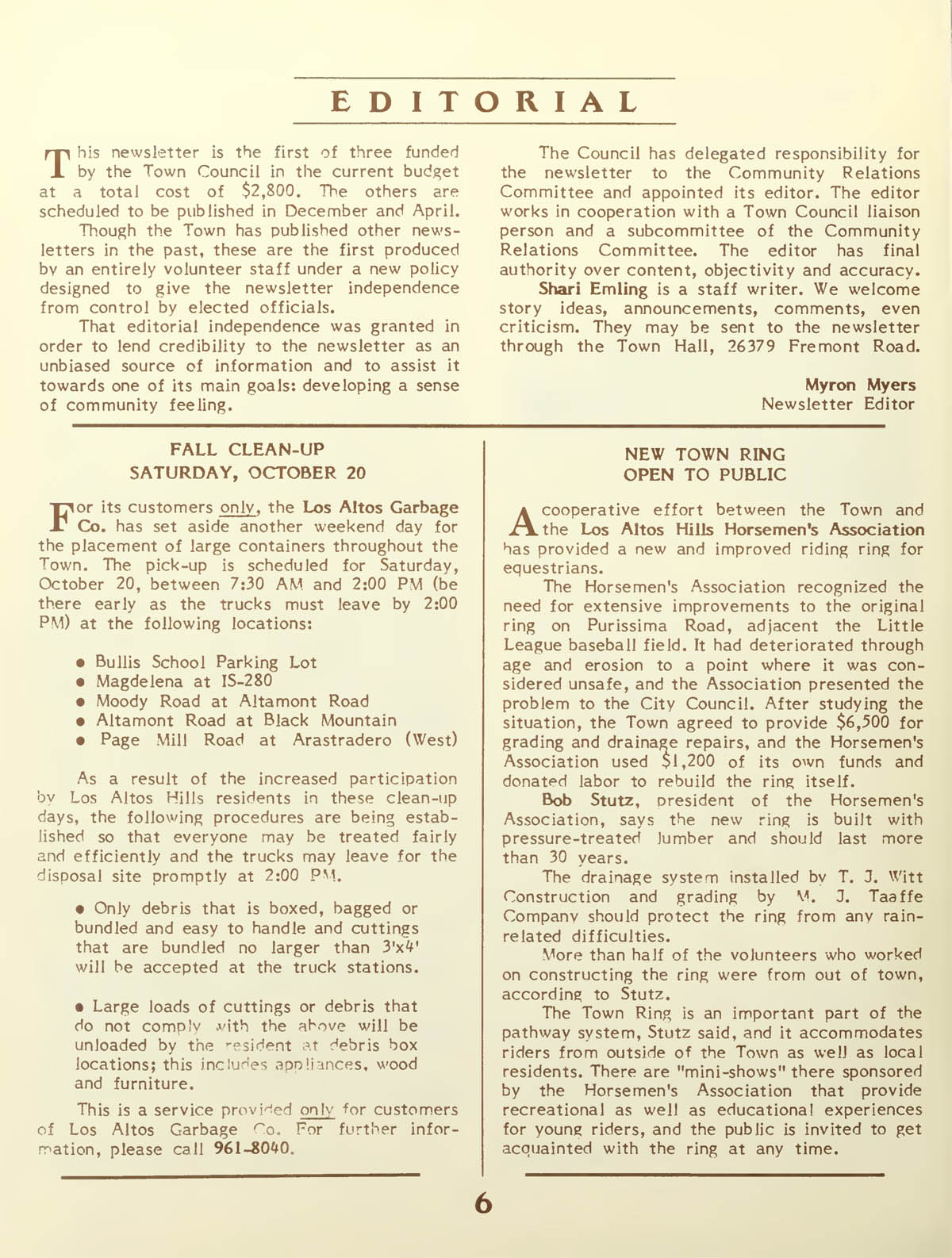 Editorial on Town Funding of Newsletters, Fall clean-up scheduled, New Town Ring open to the public. |
