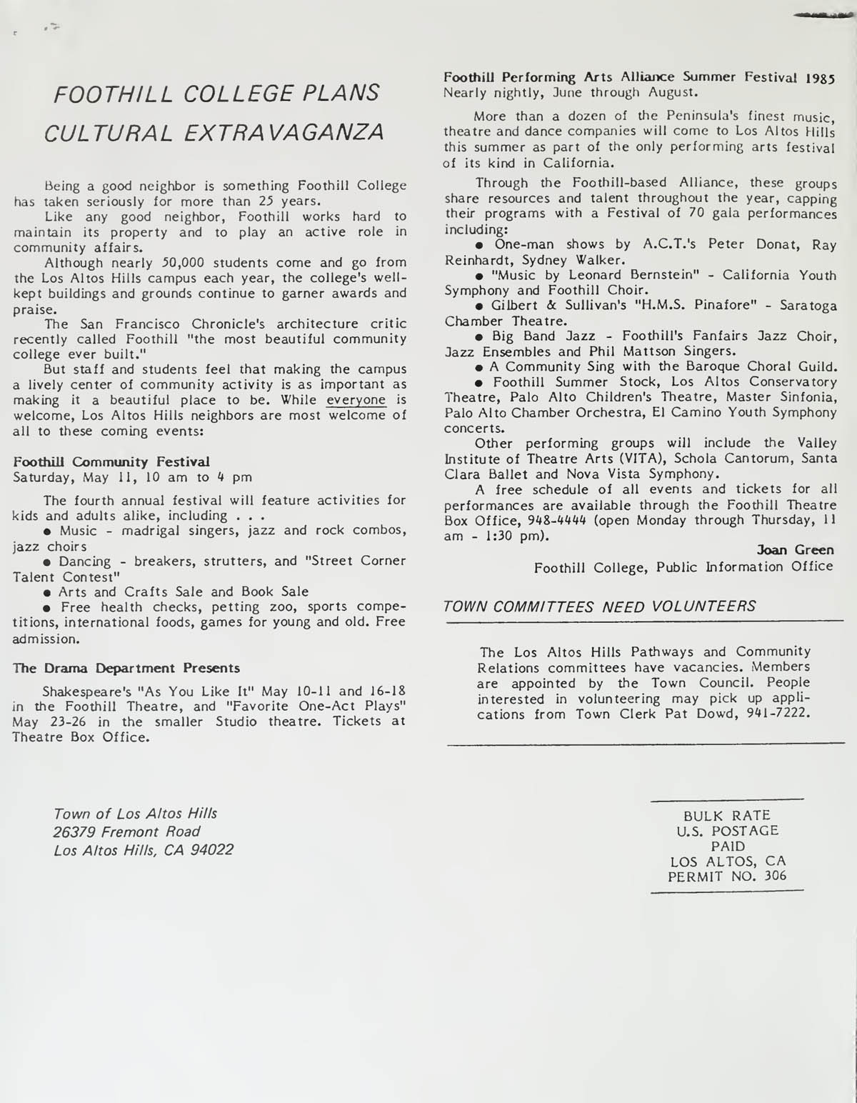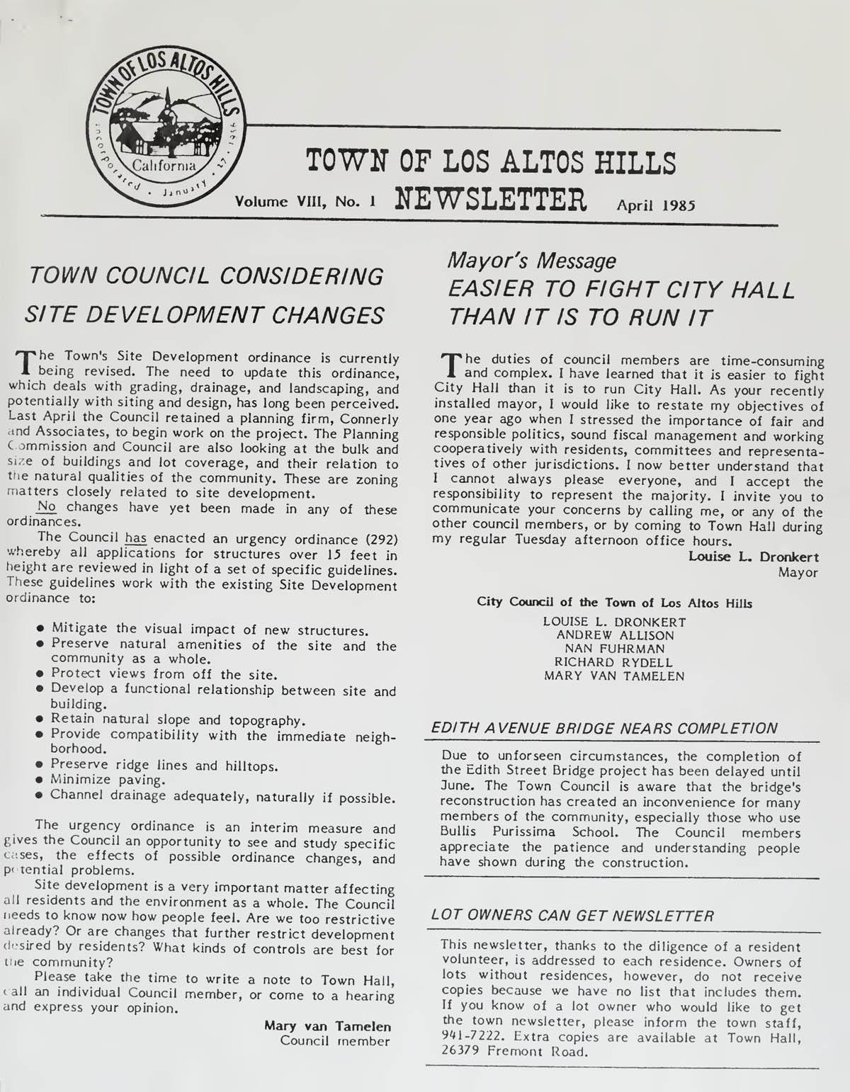 Los Altos Hills Town Newsletter - April 1985 |