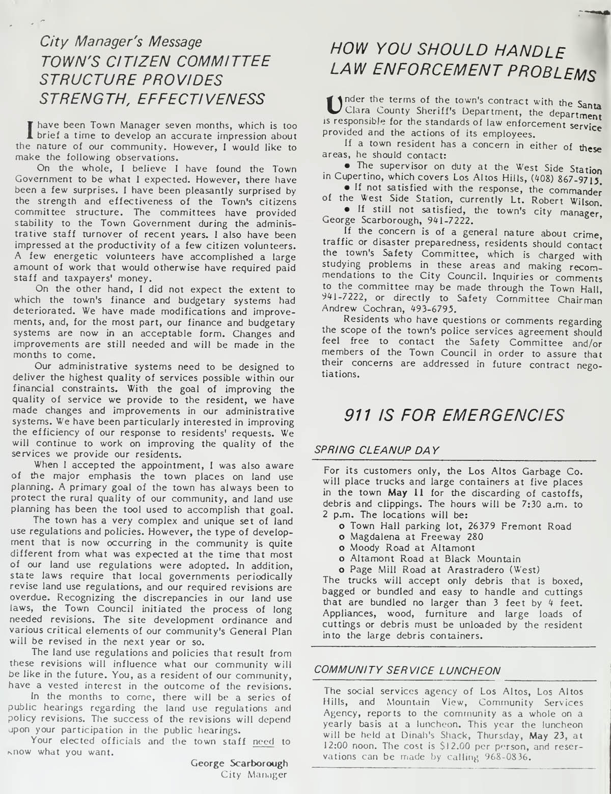 Town Manager's message - Citizen Committee structure provides strength and effectiveness, How you should handle Law Enforcement problems,