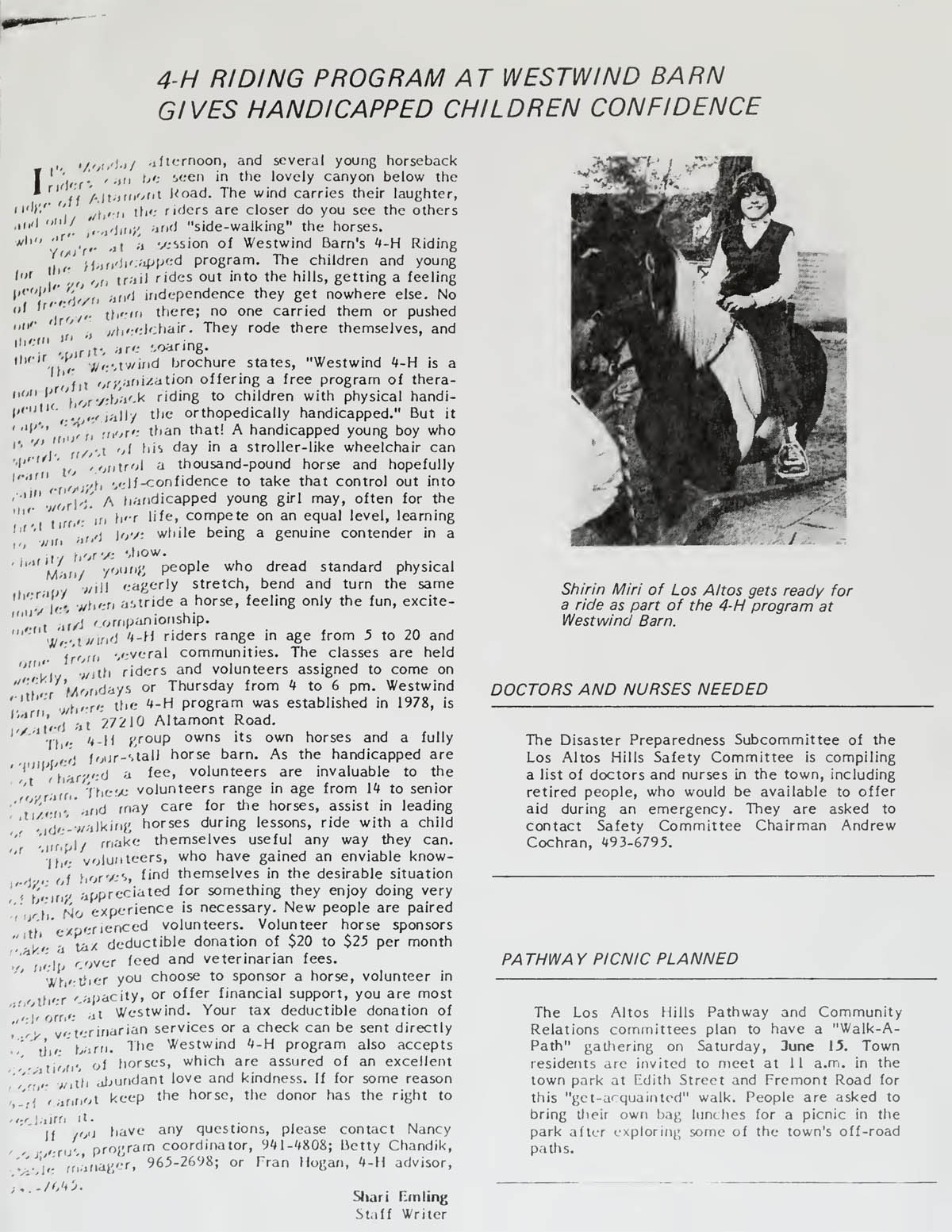 4H Riding Program at Westwind Barn gives handicapped children confidence, Doctors and Nurses needed, Pathway Picnic Planned. |