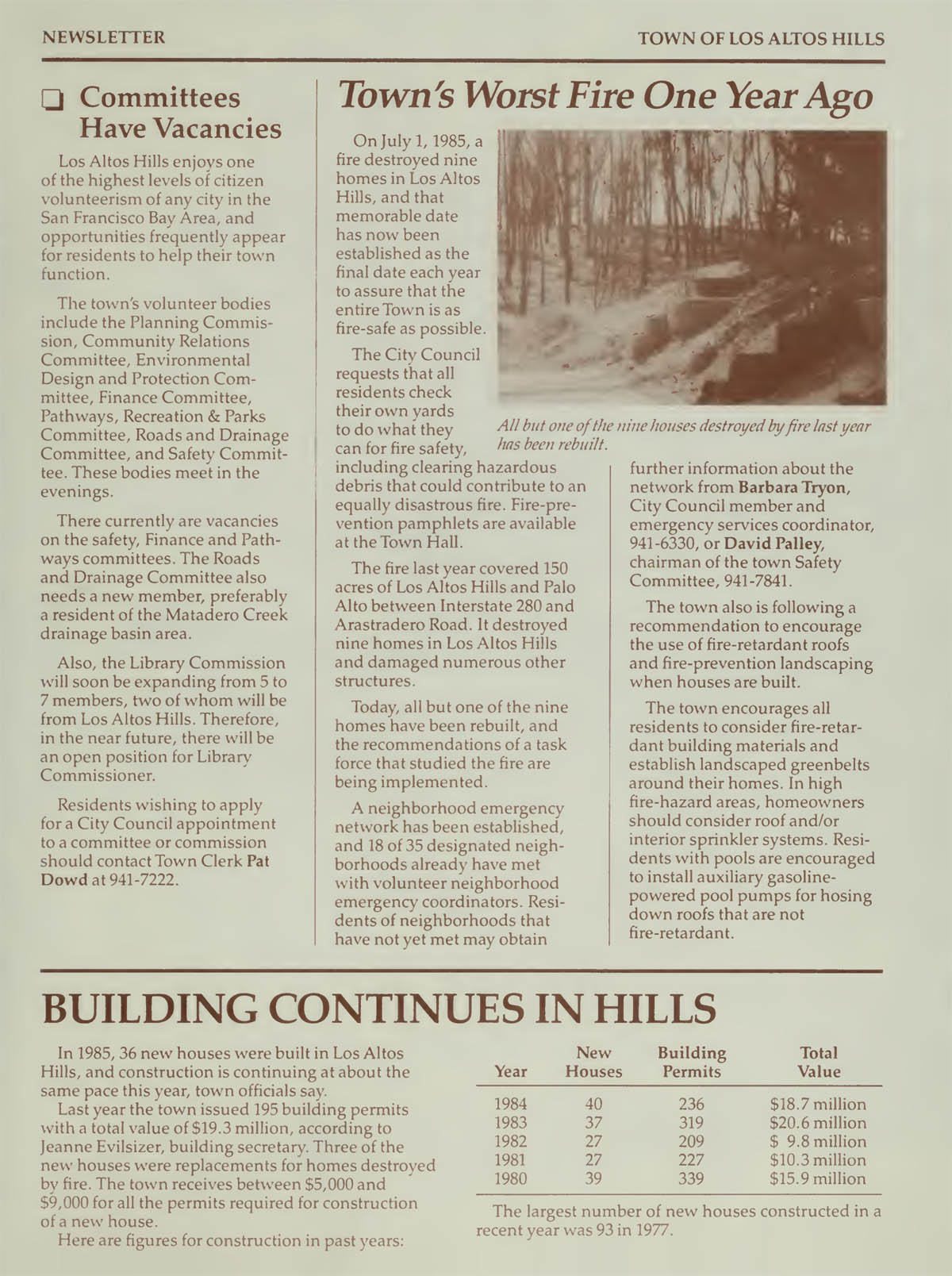 Committees have vacancies, Liddicoat - Town's worst fire one year ago, Building continues in the hills - numbers shown |