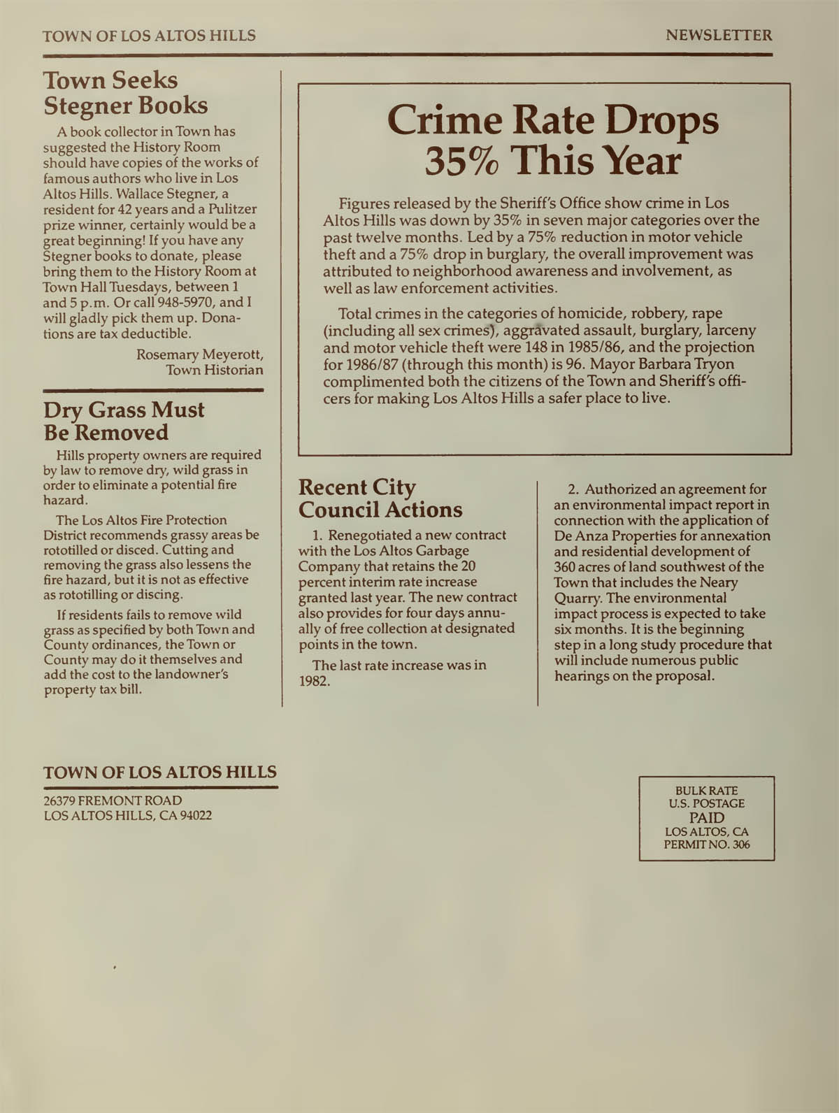 Town seeks Stegner books, Dry grass must be removed, Crime rate drops 35% this year, Recent City Council actions |