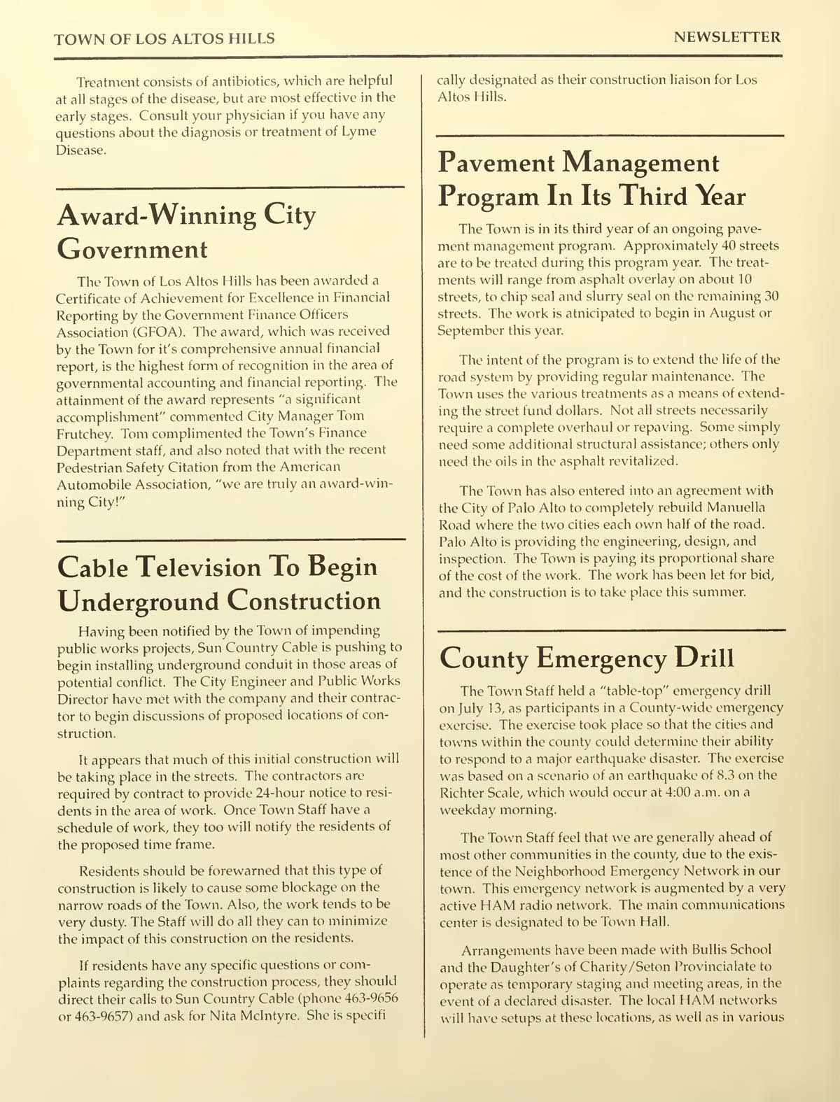 LAH receives award for Excellence in City Government, Cable TV to start underground construction, Pavement Management Program is in 3rd year,