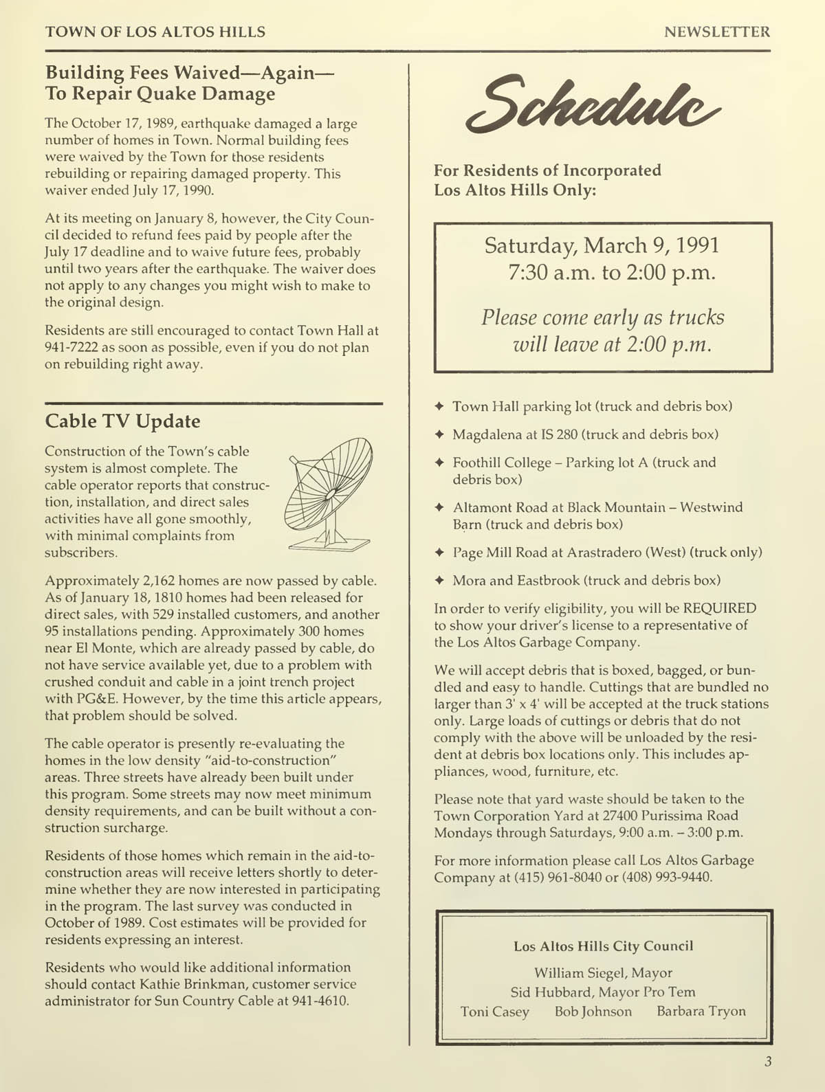 Building fees waived again for quake damage, Cable TV update, Garbage pick-up scheduled |
