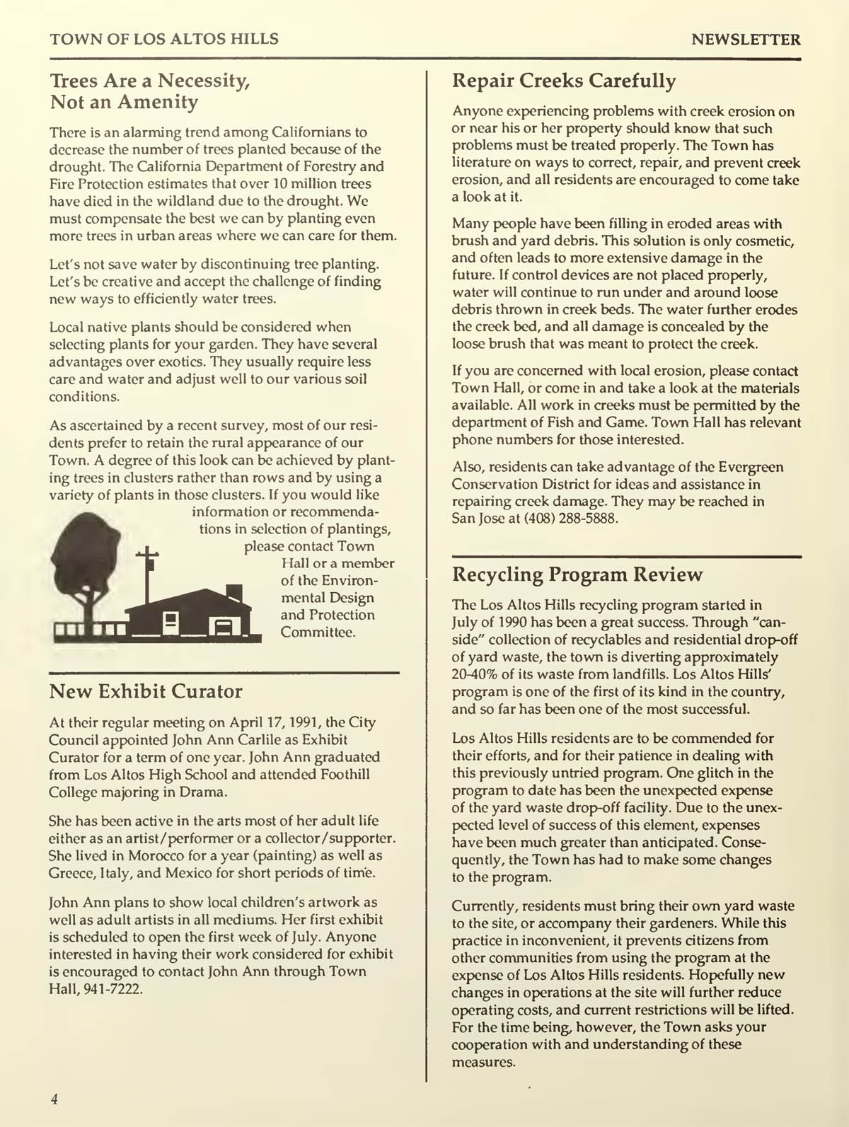 Trees are a necessity - not an amenity, John Ann Carlile appointed Exhibit Curator, Repair creeks carefully, Recycling Program Review |