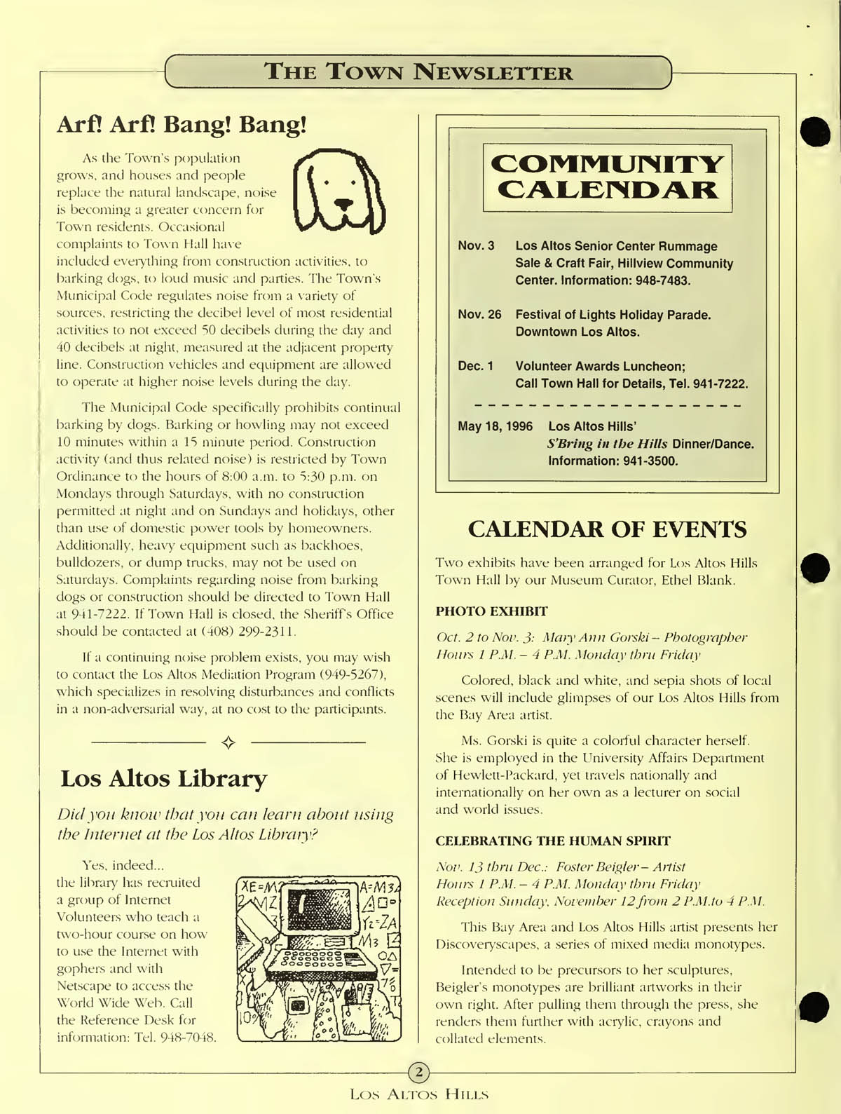 Arf! Arf! Bang! Bang! Noise nuisances and town code, Los Altos Library teaches how to use the Internet, Calendar of Events |