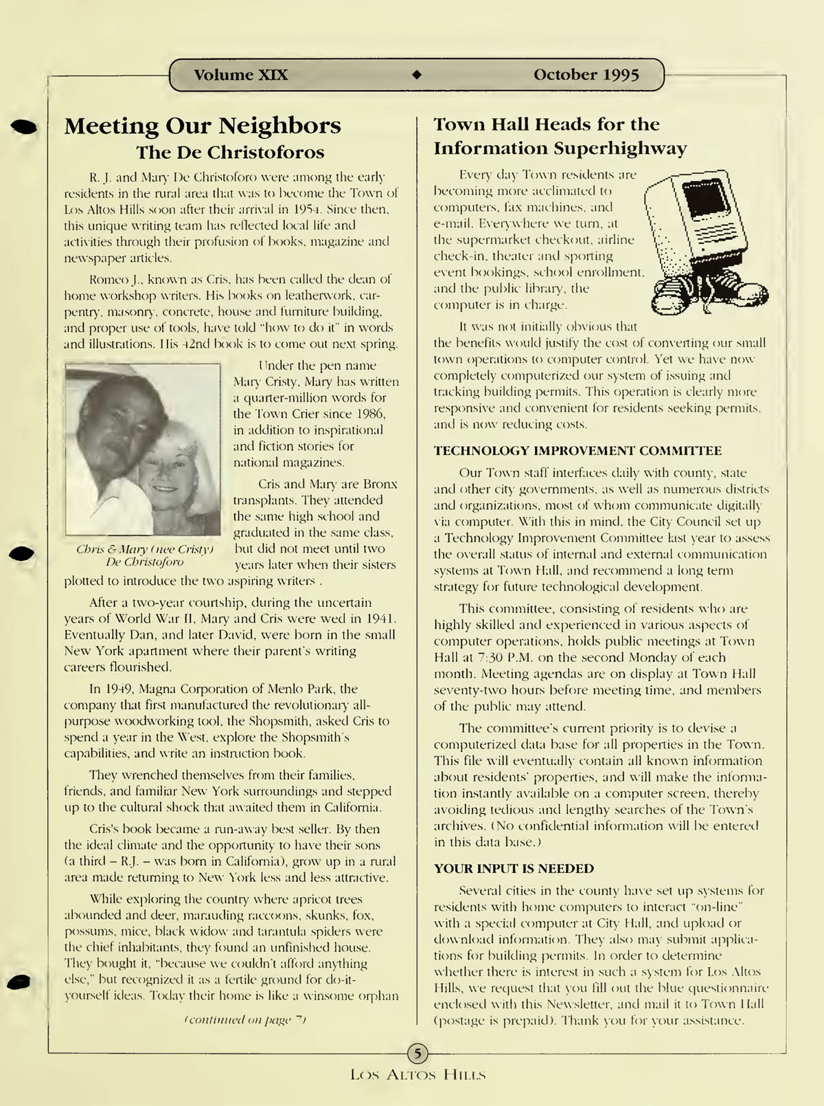 Meeting Our Neighbors - The De Christoforos, Town Hall heads for the Superhighway, Technology Improvement Committee, Your input is needed |