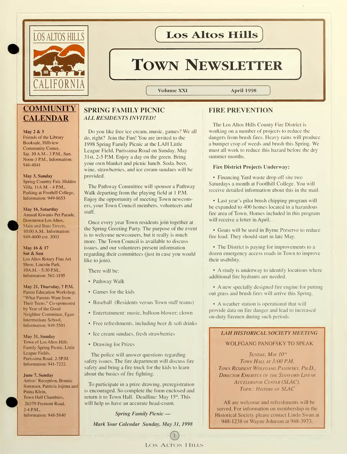 Spring Town Picnic announced - all are invited, Fire prevention measures underway, Wolfgang Panosky - Director Emeritus of SLAC to speak