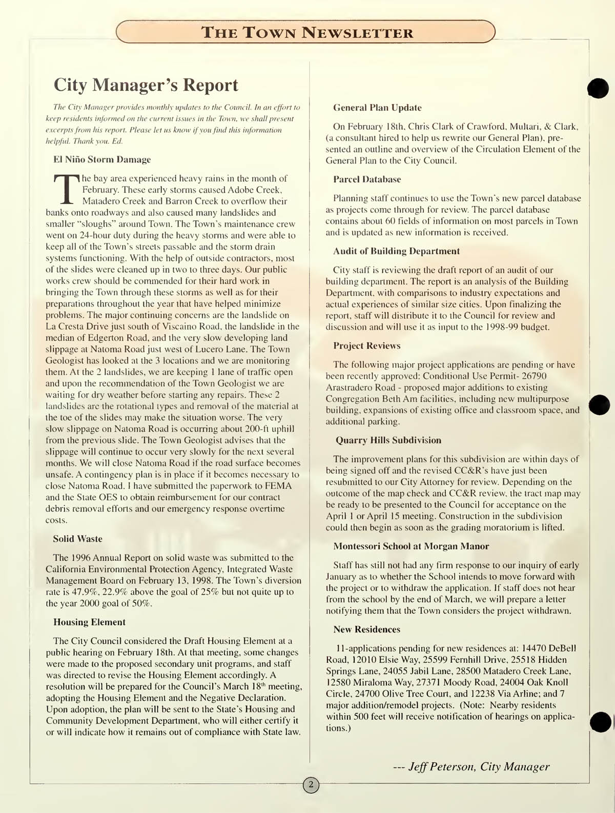 City Manager's report - El Nino damage - Annual Report on Solid Waste - Housing Element - General Plan update -