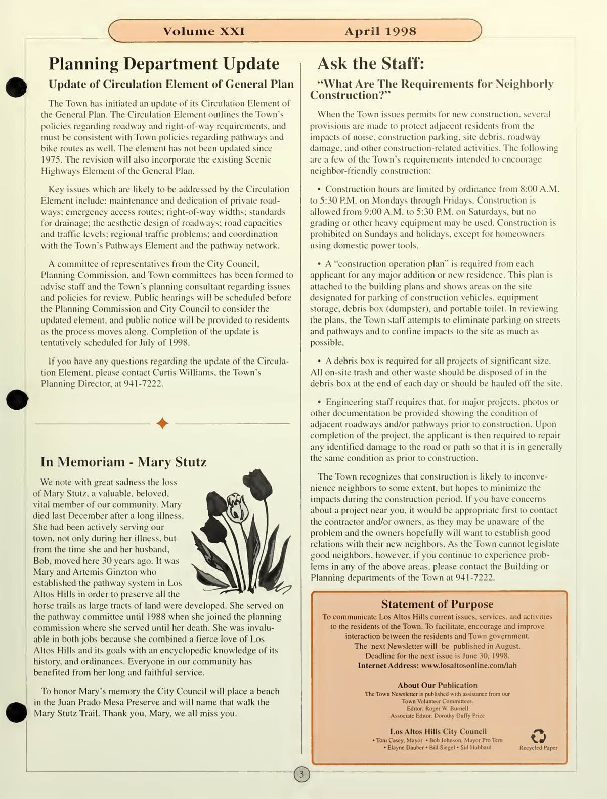 Planning Department update - Circulation Element, In Memoriam Mary Stutz, Ask The Staff - What are the rquirements for neighborly construction? |