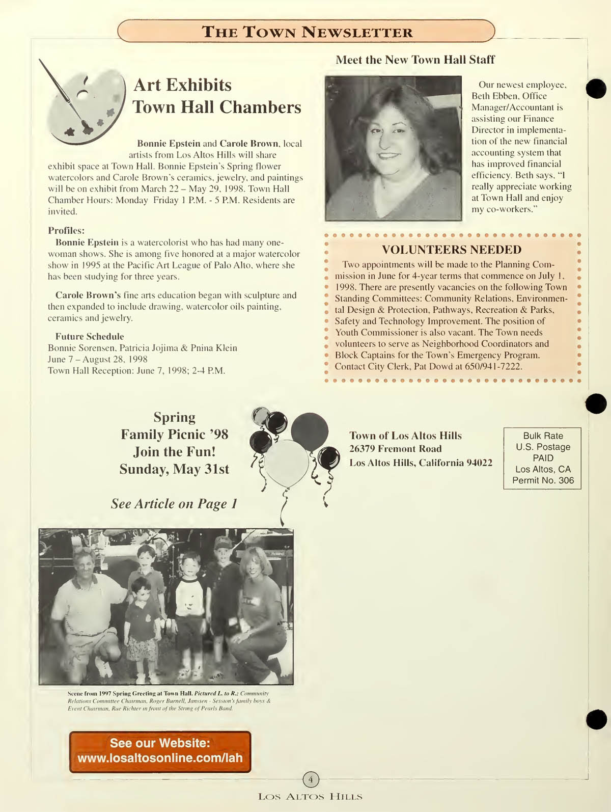 Art Exhibits in Town Hall Chambers - Bonnie Epstein and Carole Brown, Meet new Town Hall Staff Beth Ebben, Picnic Reminder May 1st |