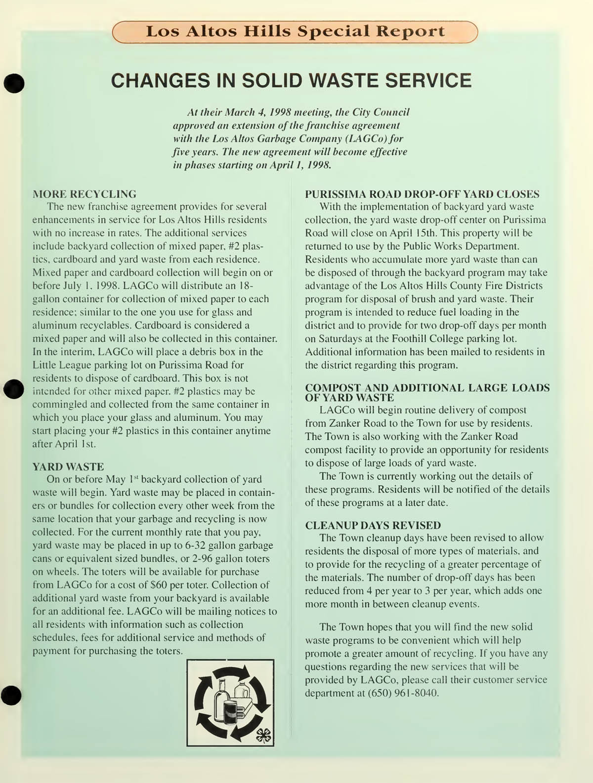 Changes in Solid Waste Service - More recycling - Yard waste collection - Purissima drop-off yard closes - Compost to be made available
